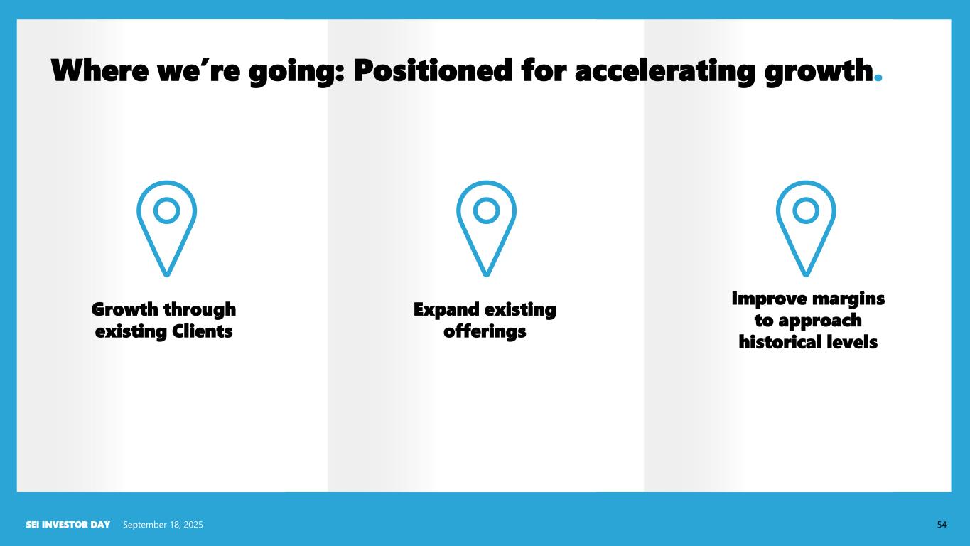 September 18, 2025SEI INVESTOR DAY 54 Where we’re going: Positioned for accelerating growth. Growth through existing Clients Expand existing offerings Improve margins to approach historical levels
