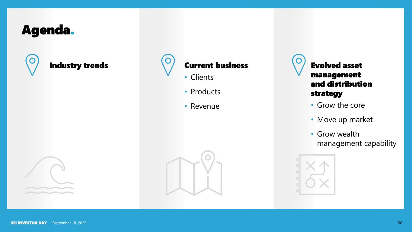 Industry trends Current business • Clients • Products • Revenue Evolved asset management and distribution strategy • Grow the core • Move up market • Grow wealth management capability September 18, 2025SEI INVESTOR DAY 56 Agenda.