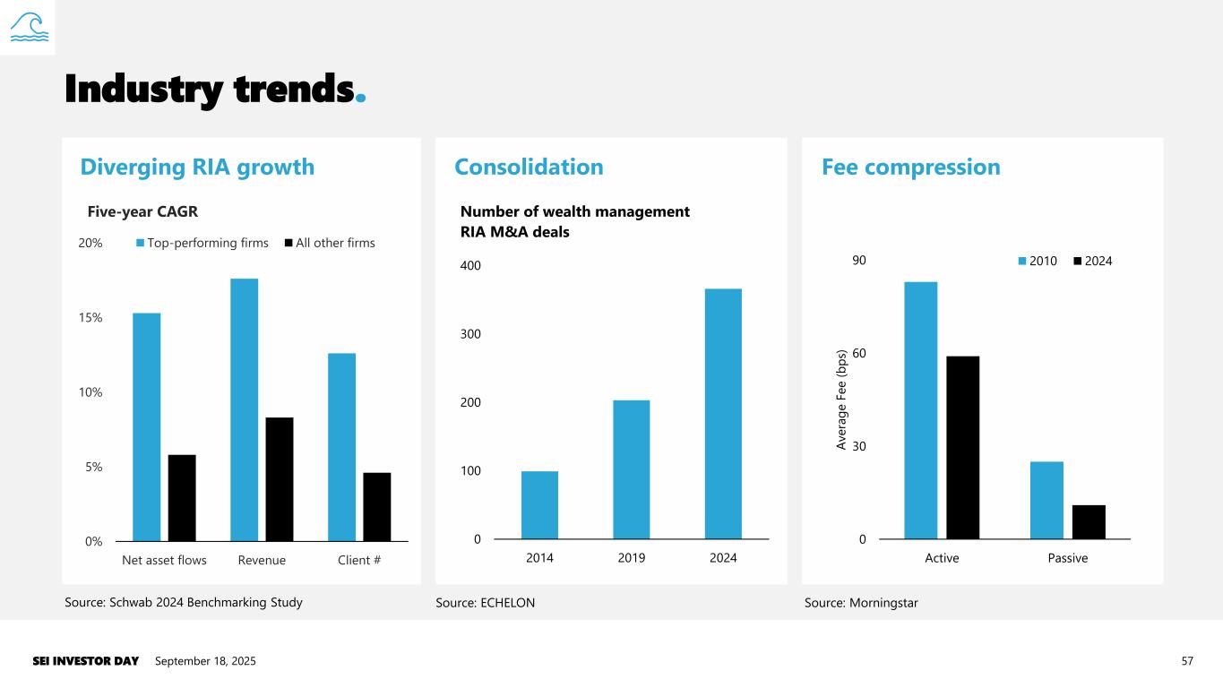 Industry trends. September 18, 2025SEI INVESTOR DAY 57 Diverging RIA growth Consolidation Fee compression 0 30 60 90 Active Passive A v e ra g e F e e ( b p s) 2010 2024 Source: Morningstar 0 100 200 300 400 2014 2019 2024 Number of wealth management RIA M&A deals Source: ECHELON 0% 5% 10% 15% 20% Net asset flows Revenue Client # Five-year CAGR Top-performing firms All other firms Source: Schwab 2024 Benchmarking Study