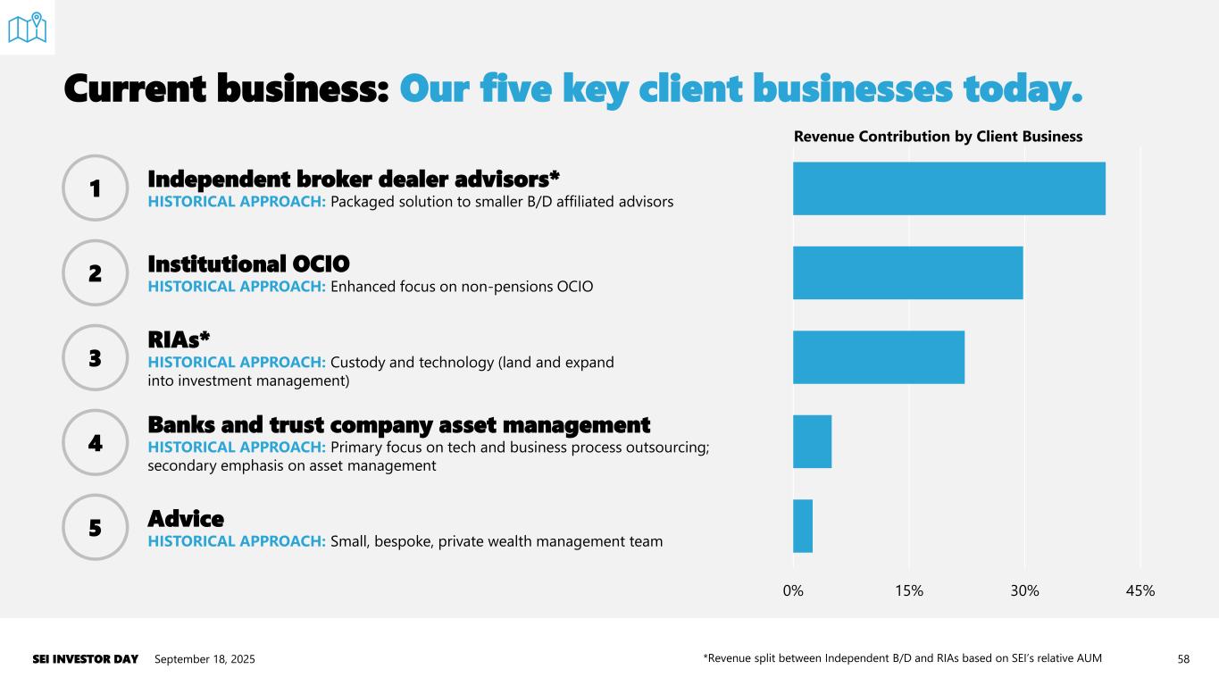 Current business: Our five key client businesses today. September 18, 2025SEI INVESTOR DAY 58 Independent broker dealer advisors* HISTORICAL APPROACH: Packaged solution to smaller B/D affiliated advisors Institutional OCIO HISTORICAL APPROACH: Enhanced focus on non-pensions OCIO RIAs* HISTORICAL APPROACH: Custody and technology (land and expand into investment management) Banks and trust company asset management HISTORICAL APPROACH: Primary focus on tech and business process outsourcing; secondary emphasis on asset management Advice HISTORICAL APPROACH: Small, bespoke, private wealth management team 0% 15% 30% 45% 2 1 3 4 5 Revenue Contribution by Client Business *Revenue split between Independent B/D and RIAs based on SEI’s relative AUM