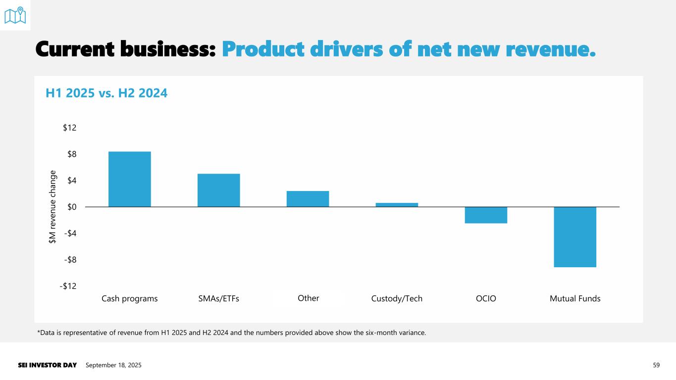 Current business: Product drivers of net new revenue. September 18, 2025SEI INVESTOR DAY 59 *Data is representative of revenue from H1 2025 and H2 2024 and the numbers provided above show the six-month variance. H1 2025 vs. H2 2024 -$12 -$8 -$4 $0 $4 $8 $12 Cash programs SMAs/ETFs Lifeyield/Other Custody/Tech OCIO Mutual Funds $ M r e v e n u e c h a n g e Other