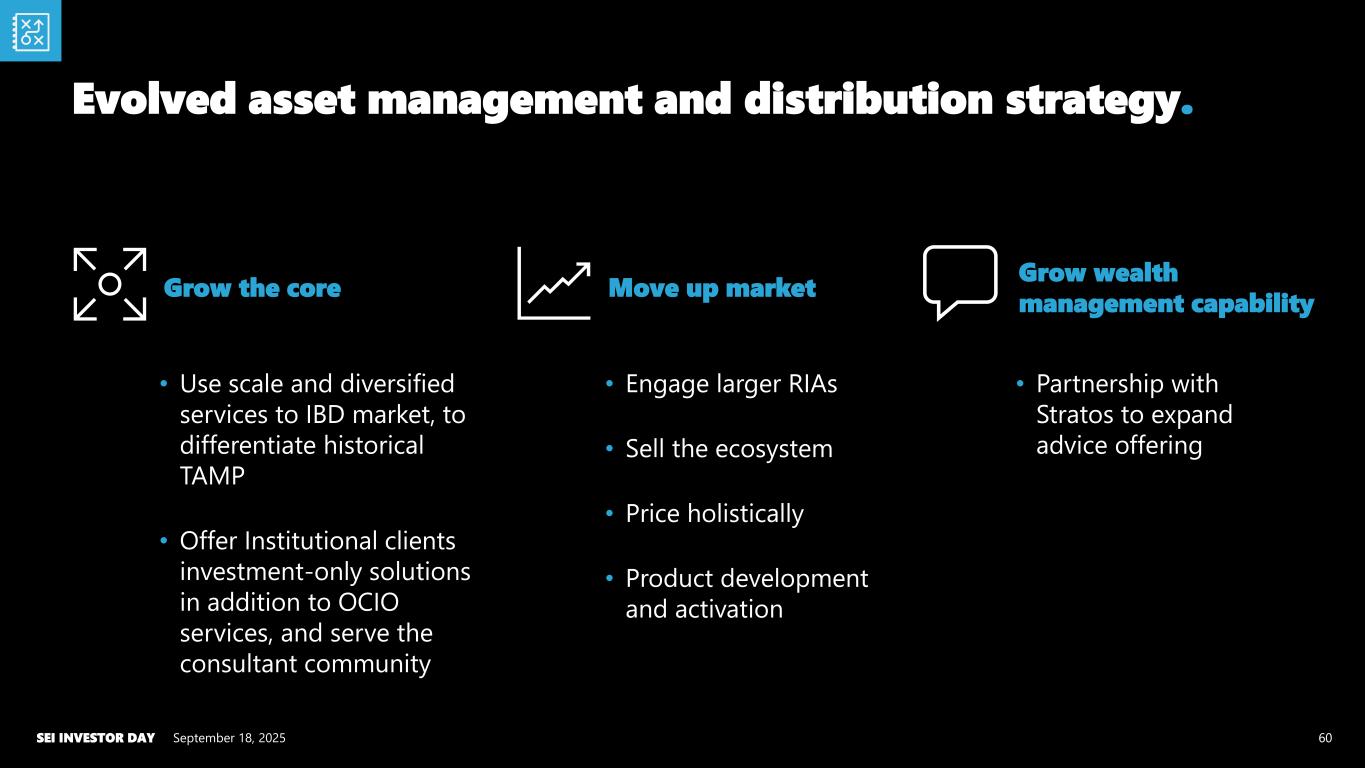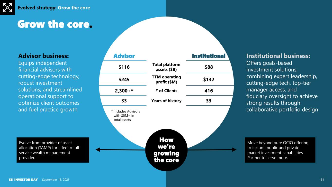 Grow the core • Use scale and diversified services to IBD market, to differentiate historical TAMP • Offer Institutional clients investment-only solutions in addition to OCIO services, and serve the consultant community Move up market • Partnership with Stratos to expand advice offering Grow wealth management capability • Engage larger RIAs • Sell the ecosystem • Price holistically • Product development and activation September 18, 2025SEI INVESTOR DAY 60 Evolved asset management and distribution strategy.