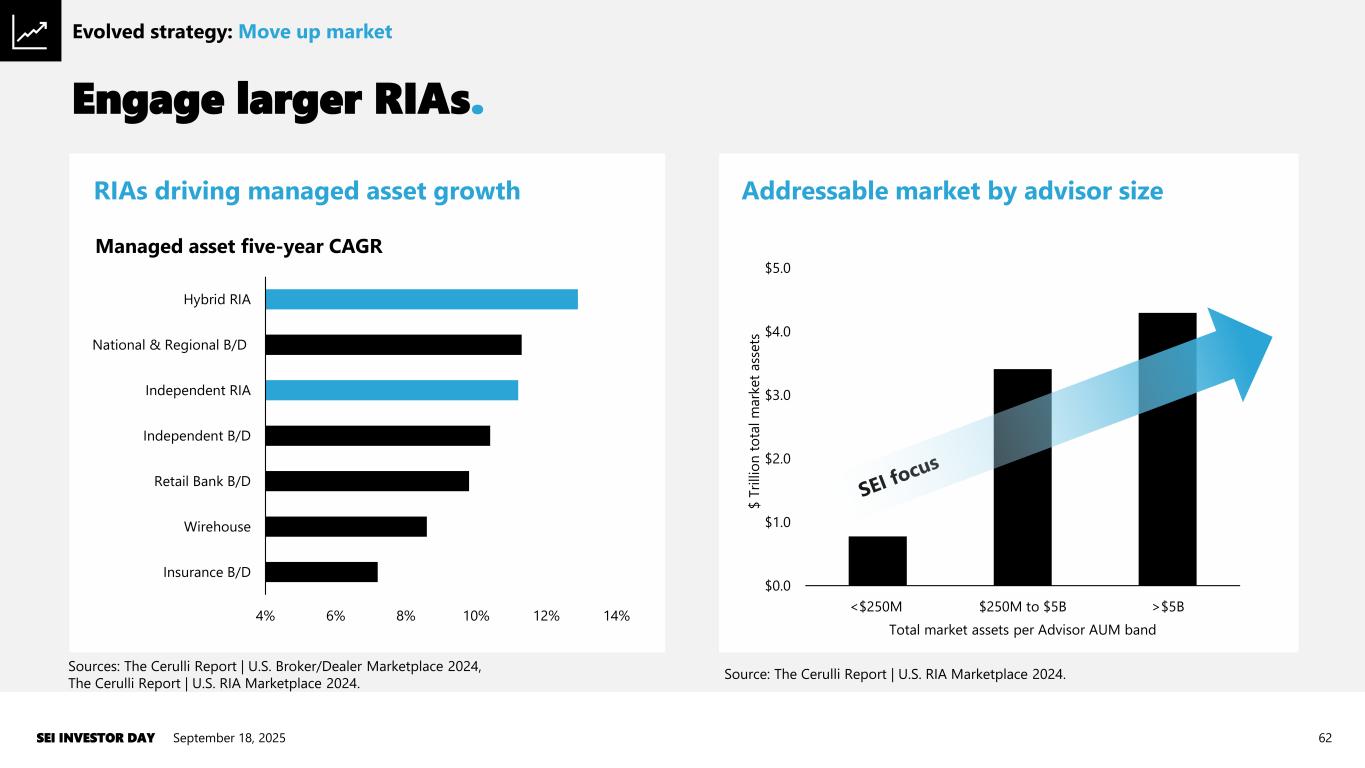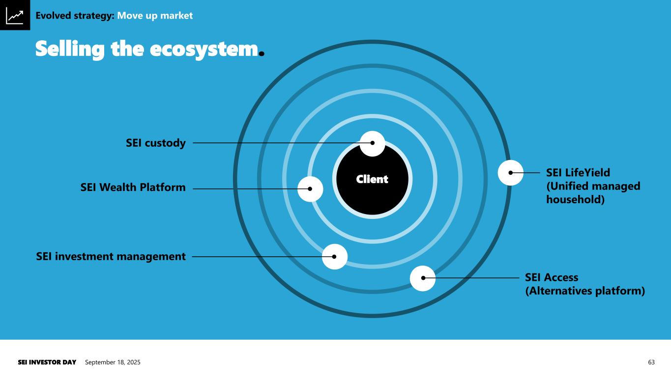Engage larger RIAs. September 18, 2025SEI INVESTOR DAY 62 4% 6% 8% 10% 12% 14% Insurance B/D Wirehouse Retail Bank B/D Independent B/D Independent RIA National & Regional B/D Hybrid RIA Managed asset five-year CAGR Sources: The Cerulli Report ǀ U.S. Broker/Dealer Marketplace 2024, The Cerulli Report ǀ U.S. RIA Marketplace 2024. $0.0 $1.0 $2.0 $3.0 $4.0 $5.0 <$250M $250M to $5B >$5B $ T ri ll io n t o ta l m a rk e t a ss e ts Total market assets per Advisor AUM band Source: The Cerulli Report ǀ U.S. RIA Marketplace 2024. RIAs driving managed asset growth Addressable market by advisor size Evolved strategy: Move up market