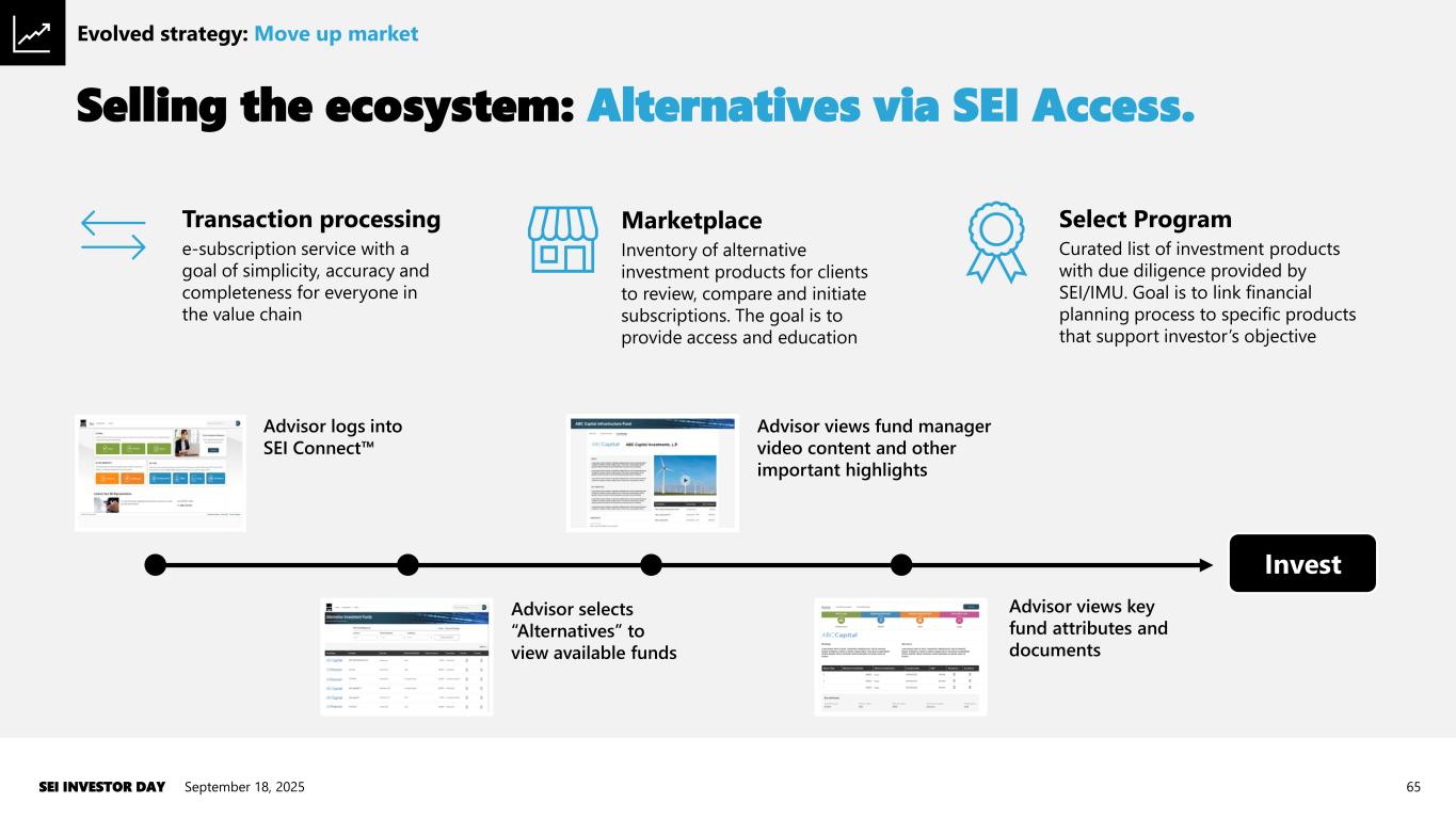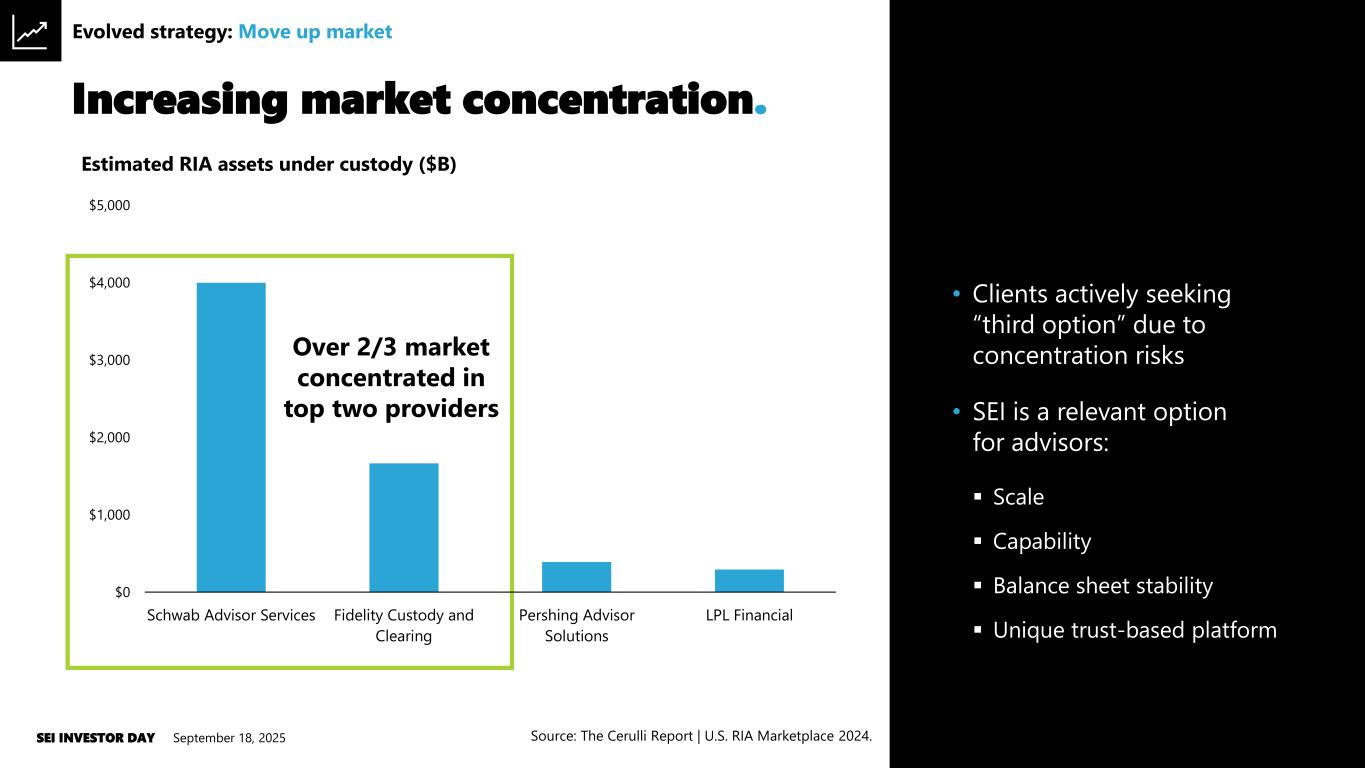Increasing market concentration. September 18, 2025SEI INVESTOR DAY 64Source: The Cerulli Report ǀ U.S. RIA Marketplace 2024. Evolved strategy: Move up market $0 $1,000 $2,000 $3,000 $4,000 $5,000 Schwab Advisor Services Fidelity Custody and Clearing Pershing Advisor Solutions LPL Financial Estimated RIA assets under custody ($B) Over 2/3 market concentrated in top two providers • Clients actively seeking “third option” due to concentration risks • SEI is a relevant option for advisors: ▪ Scale ▪ Capability ▪ Balance sheet stability ▪ Unique trust-based platform