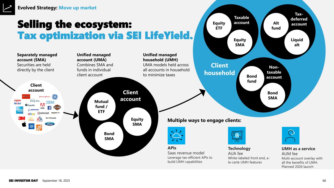Advisor selects “Alternatives” to view available funds Advisor views fund manager video content and other important highlights Advisor views key fund attributes and documents Invest Transaction processing e-subscription service with a goal of simplicity, accuracy and completeness for everyone in the value chain Marketplace Inventory of alternative investment products for clients to review, compare and initiate subscriptions. The goal is to provide access and education Select Program Curated list of investment products with due diligence provided by SEI/IMU. Goal is to link financial planning process to specific products that support investor’s objective Selling the ecosystem: Alternatives via SEI Access. September 18, 2025SEI INVESTOR DAY 65 Advisor logs into SEI Connect Evolved strategy: Move up market
