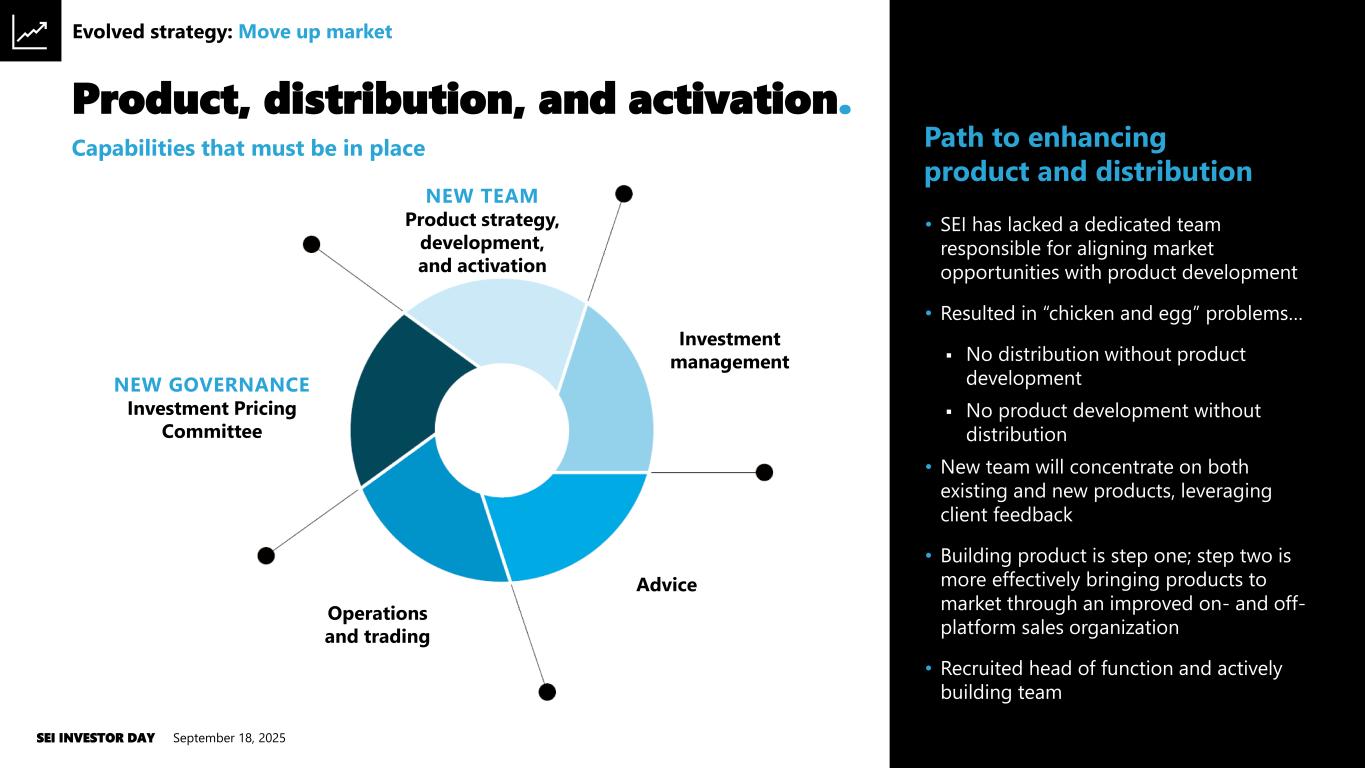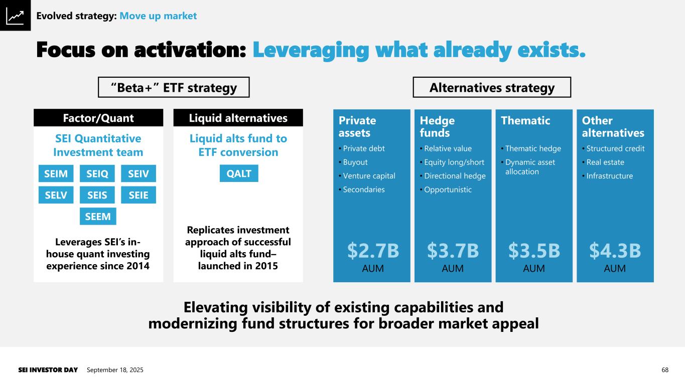 Investment management Advice Operations and trading NEW TEAM Product strategy, development, and activation NEW GOVERNANCE Investment Pricing Committee Product, distribution, and activation. September 18, 2025SEI INVESTOR DAY 67 Capabilities that must be in place Evolved strategy: Move up market • SEI has lacked a dedicated team responsible for aligning market opportunities with product development • Resulted in “chicken and egg” problems… ▪ No distribution without product development ▪ No product development without distribution • New team will concentrate on both existing and new products, leveraging client feedback • Building product is step one; step two is more effectively bringing products to market through an improved on- and off- platform sales organization • Recruited head of function and actively building team Path to enhancing product and distribution