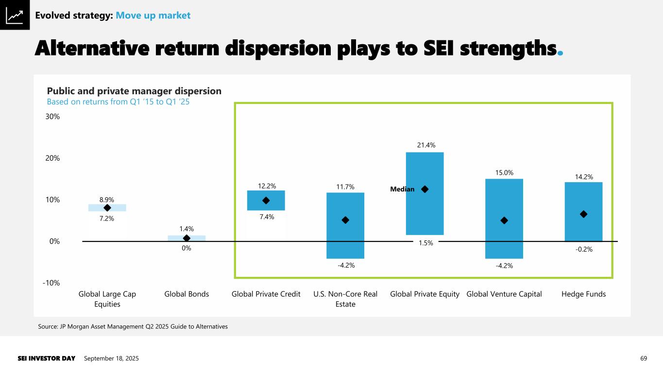 Alternative return dispersion plays to SEI strengths. September 18, 2025SEI INVESTOR DAY 69 Source: JP Morgan Asset Management Q2 2025 Guide to Alternatives -10% 0% 10% 20% 30% Global Large Cap Equities Global Bonds Global Private Credit U.S. Non-Core Real Estate Global Private Equity Global Venture Capital Hedge Funds Median 8.9% 7.2% 1.4% 0% 12.2% 7.4% 11.7% -4.2% 21.4% 1.5% 15.0% 14.2% -0.2% -4.2% Public and private manager dispersion Based on returns from Q1 ’15 to Q1 ‘25 Evolved strategy: Move up market