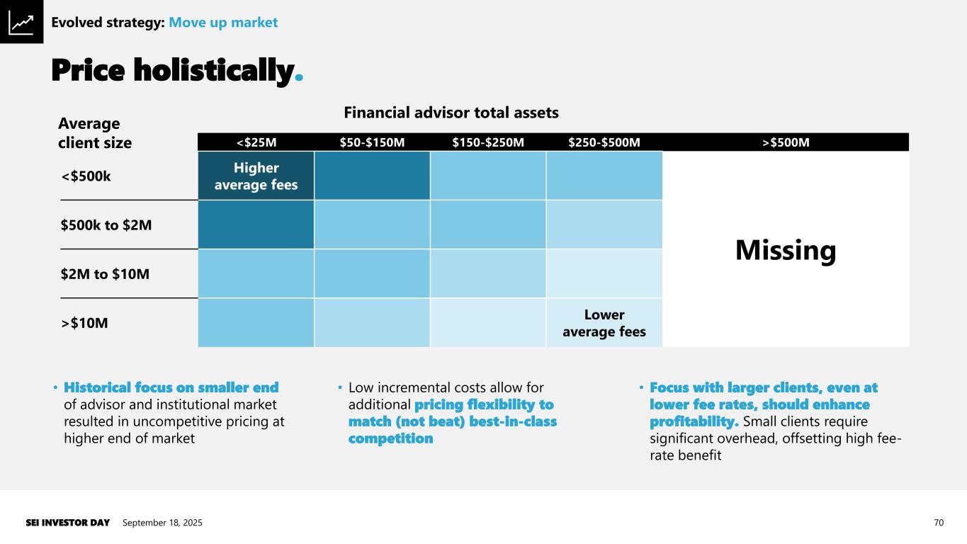 Price holistically. September 18, 2025SEI INVESTOR DAY 70 <$25M $50-$150M $150-$250M $250-$500M >$500M <$500k Higher average fees Missing $500k to $2M $2M to $10M >$10M Lower average fees Average client size Financial advisor total assets Evolved strategy: Move up market • Historical focus on smaller end of advisor and institutional market resulted in uncompetitive pricing at higher end of market • Low incremental costs allow for additional pricing flexibility to match (not beat) best-in-class competition • Focus with larger clients, even at lower fee rates, should enhance profitability. Small clients require significant overhead, offsetting high fee- rate benefit