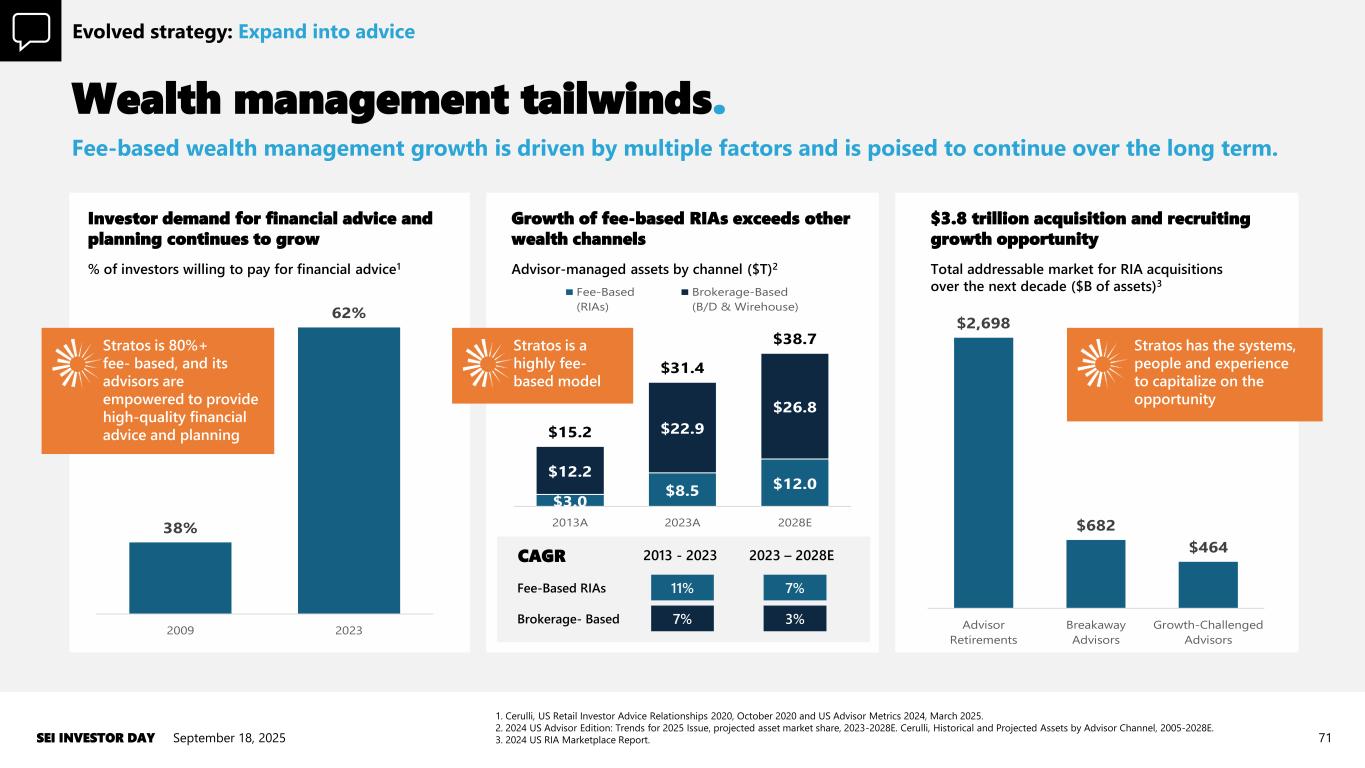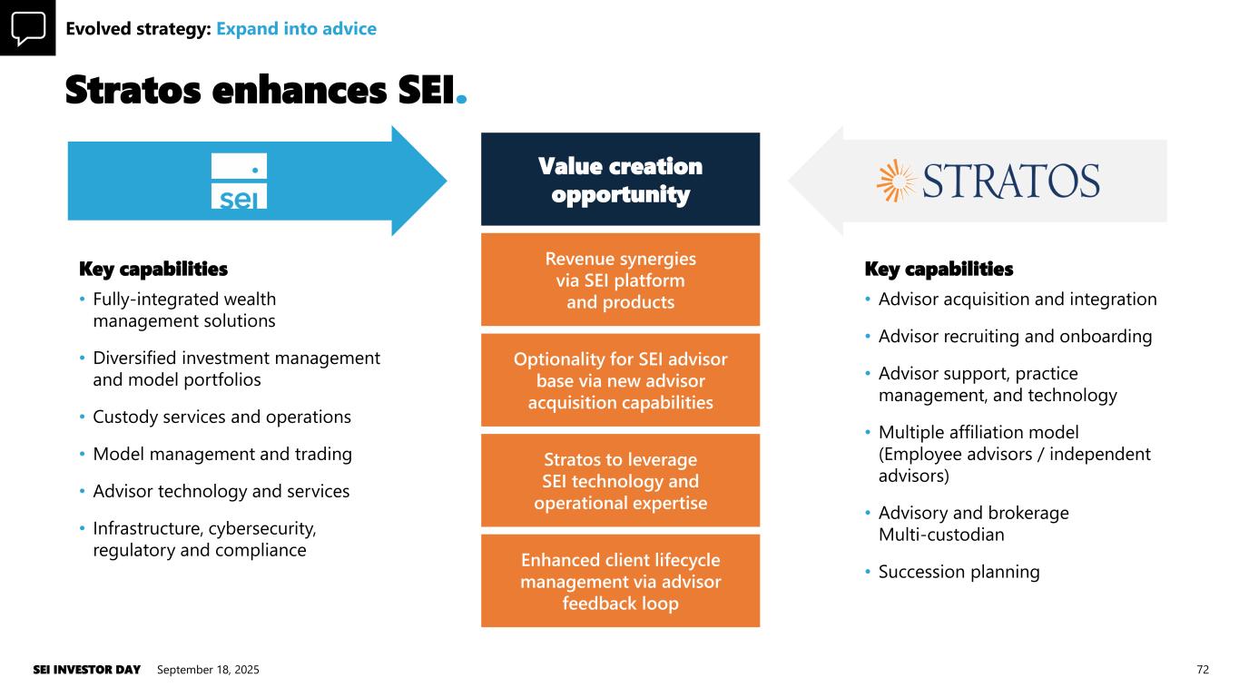 1. Cerulli, US Retail Investor Advice Relationships 2020, October 2020 and US Advisor Metrics 2024, March 2025. 2. 2024 US Advisor Edition: Trends for 2025 Issue, projected asset market share, 2023-2028E. Cerulli, Historical and Projected Assets by Advisor Channel, 2005-2028E. 3. 2024 US RIA Marketplace Report. Investor demand for financial advice and planning continues to grow Growth of fee-based RIAs exceeds other wealth channels $3.8 trillion acquisition and recruiting growth opportunity 38% 62% 2009 2023 % of investors willing to pay for financial advice1 $2,698 $682 $464 Advisor Retirements Breakaway Advisors Growth-Challenged Advisors Total addressable market for RIA acquisitions over the next decade ($B of assets)3 Advisor-managed assets by channel ($T)2 $3.0 $8.5 $12.0 $12.2 $22.9 $26.8 $15.2 $31.4 $38.7 2013A 2023A 2028E Fee-Based (RIAs) Brokerage-Based (B/D & Wirehouse) CAGR 11% 7% 7% 3% Fee-Based RIAs Brokerage- Based 2013 - 2023 2023 – 2028E Wealth management tailwinds. September 18, 2025SEI INVESTOR DAY 71 Fee-based wealth management growth is driven by multiple factors and is poised to continue over the long term. Evolved strategy: Expand into advice Stratos is 80%+ fee- based, and its advisors are empowered to provide high-quality financial advice and planning Stratos is a highly fee- based model Stratos has the systems, people and experience to capitalize on the opportunity