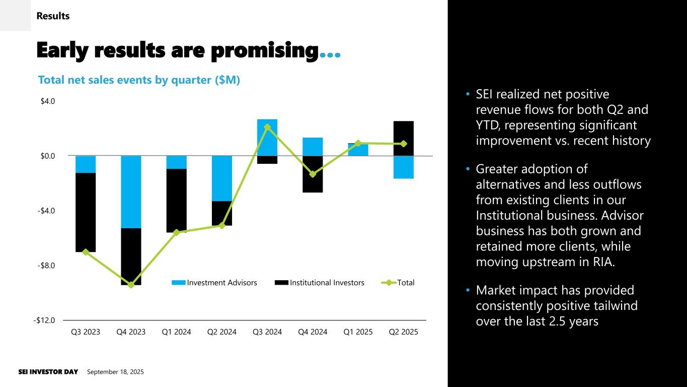• SEI realized net positive revenue flows for both Q2 and YTD, representing significant improvement vs. recent history • Greater adoption of alternatives and less outflows from existing clients in our Institutional business. Advisor business has both grown and retained more clients, while moving upstream in RIA. • Market impact has provided consistently positive tailwind over the last 2.5 years Early results are promising… September 18, 2025SEI INVESTOR DAY 73 -$12.0 -$8.0 -$4.0 $0.0 $4.0 Q3 2023 Q4 2023 Q1 2024 Q2 2024 Q3 2024 Q4 2024 Q1 2025 Q2 2025 Investment Advisors Institutional Investors Total Total net sales events by quarter ($M) Results
