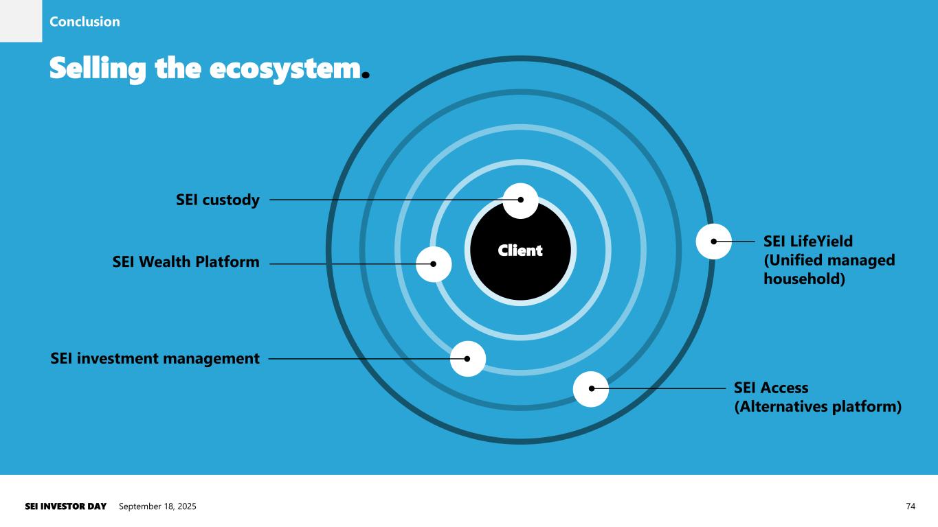 Selling the ecosystem. September 18, 2025SEI INVESTOR DAY 74 SEI Wealth Platform SEI investment management SEI Access (Alternatives platform) SEI LifeYield (Unified managed household) SEI custody Client Conclusion