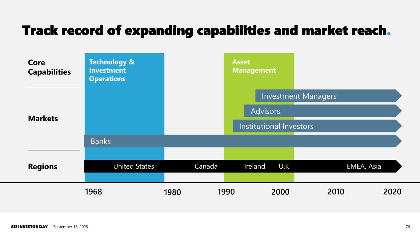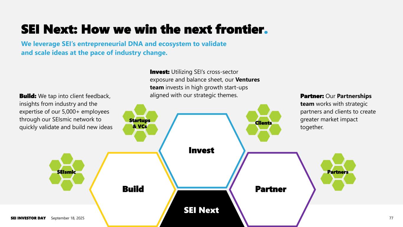 1968 1980 1990 2000 Regions Markets Core Capabilities Technology & Investment Operations Asset Management 2010 United States Canada EMEA, AsiaIreland U.K. 2020 Track record of expanding capabilities and market reach. September 18, 2025SEI INVESTOR DAY 76 Banks Institutional Investors Advisors Investment Managers