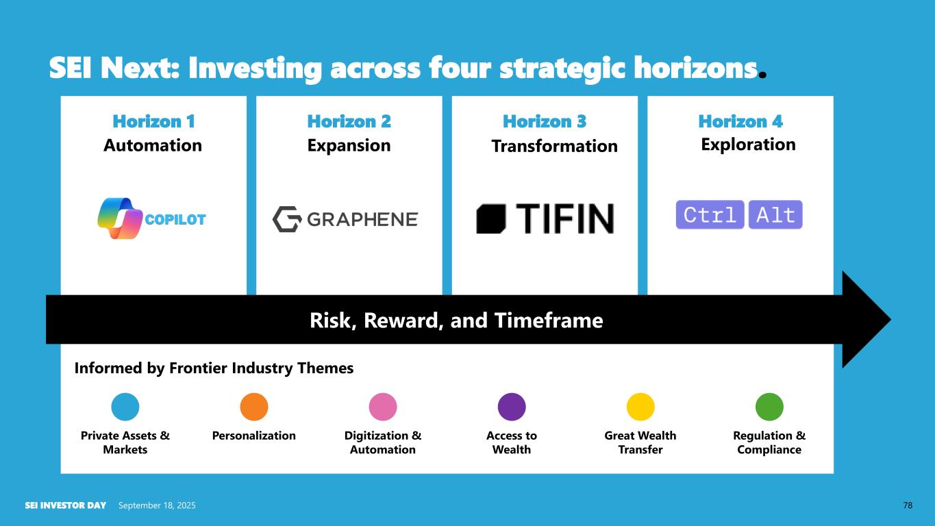 Build: We tap into client feedback, insights from industry and the expertise of our 5,000+ employees through our SEIsmic network to quickly validate and build new ideas Invest: Utilizing SEI’s cross-sector exposure and balance sheet, our Ventures team invests in high growth start-ups aligned with our strategic themes. Partner: Our Partnerships team works with strategic partners and clients to create greater market impact together. We leverage SEI’s entrepreneurial DNA and ecosystem to validate and scale ideas at the pace of industry change. SEI Next: How we win the next frontier. September 18, 2025SEI INVESTOR DAY 77 SEI Next Build Invest Partner SEIsmic Startups & VCs Partners Clients