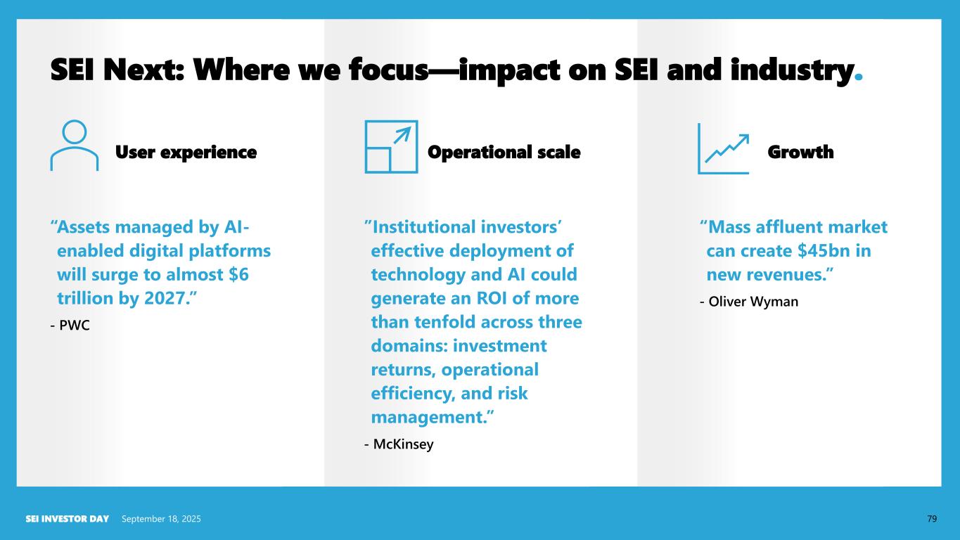 Private Assets & Markets Personalization Digitization & Automation Access to Wealth Great Wealth Transfer Regulation & Compliance Horizon 1 Horizon 2 Horizon 3 Horizon 4 Informed by Frontier Industry Themes Risk, Reward, and Timeframe September 18, 2025SEI INVESTOR DAY 78 SEI Next: Investing across four strategic horizons. Automation Expansion Transformation Exploration