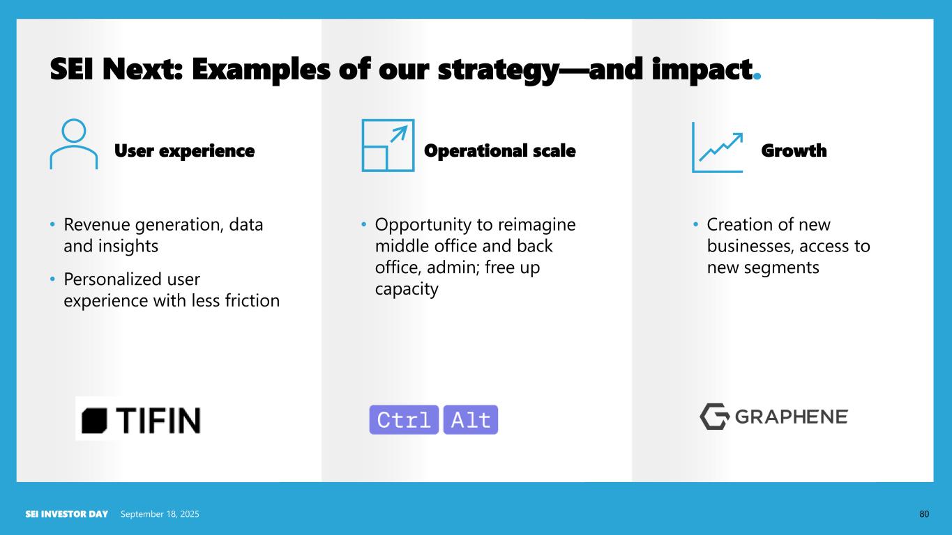 User experience “Assets managed by AI- enabled digital platforms will surge to almost $6 trillion by 2027.” - PWC Operational scale “Mass affluent market can create $45bn in new revenues.” - Oliver Wyman ”Institutional investors’ effective deployment of technology and AI could generate an ROI of more than tenfold across three domains: investment returns, operational efficiency, and risk management.” - McKinsey September 18, 2025SEI INVESTOR DAY 79 SEI Next: Where we focus—impact on SEI and industry. Growth