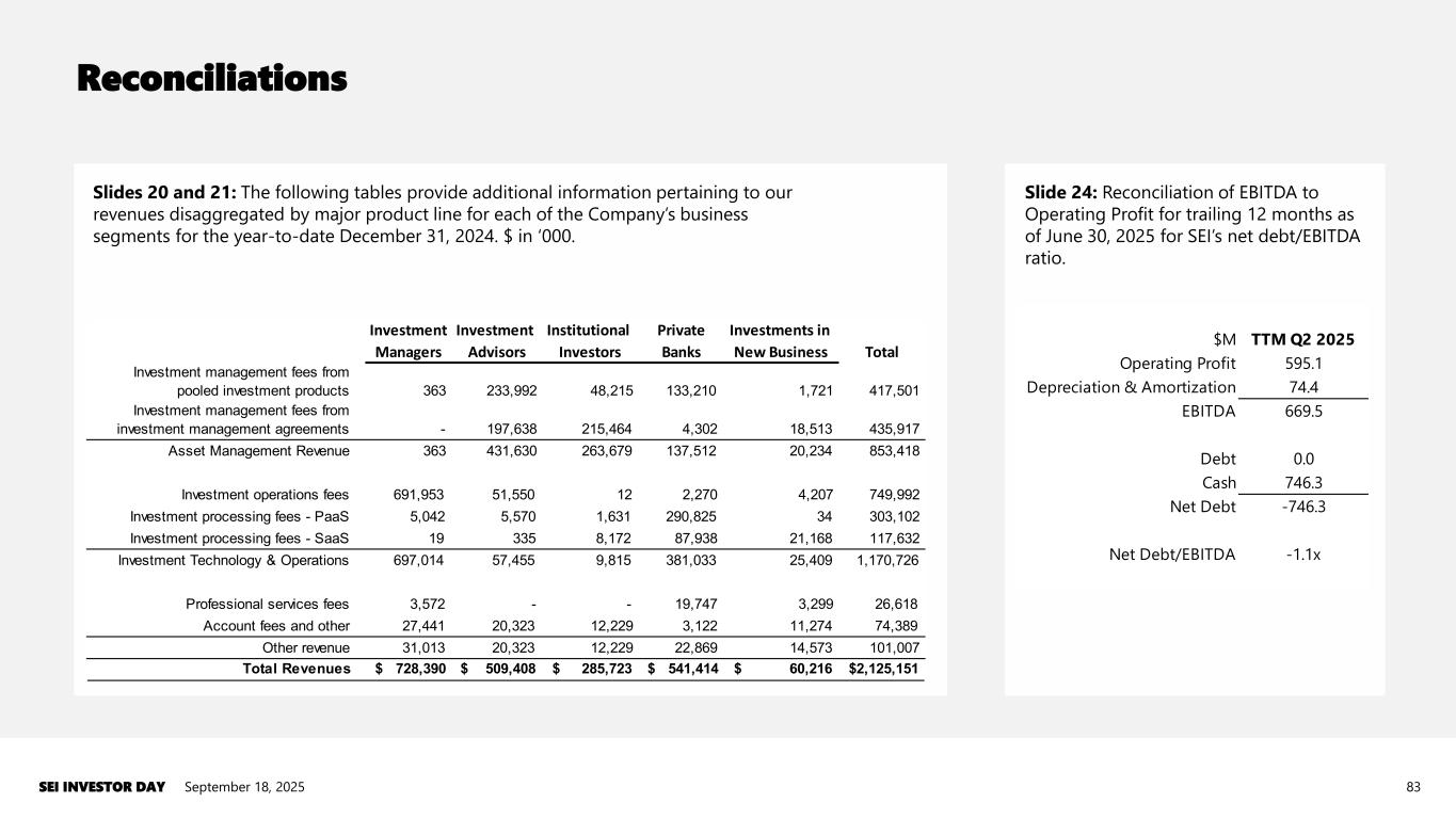 Reconciliations SEI INVESTOR DAY 83 Slides 20 and 21: The following tables provide additional information pertaining to our revenues disaggregated by major product line for each of the Company’s business segments for the year-to-date December 31, 2024. $ in ‘000. Investment Investment Institutional Private Investments in Managers Advisors Investors Banks New Business Total Investment management fees from pooled investment products 363 233,992 48,215 133,210 1,721 417,501 Investment management fees from investment management agreements - 197,638 215,464 4,302 18,513 435,917 Asset Management Revenue 363 431,630 263,679 137,512 20,234 853,418 Investment operations fees 691,953 51,550 12 2,270 4,207 749,992 Investment processing fees - PaaS 5,042 5,570 1,631 290,825 34 303,102 Investment processing fees - SaaS 19 335 8,172 87,938 21,168 117,632 Investment Technology & Operations 697,014 57,455 9,815 381,033 25,409 1,170,726 Professional services fees 3,572 - - 19,747 3,299 26,618 Account fees and other 27,441 20,323 12,229 3,122 11,274 74,389 Other revenue 31,013 20,323 12,229 22,869 14,573 101,007 Total Revenues $ 728,390 $ 509,408 $ 285,723 $ 541,414 $ 60,216 $2,125,151 September 18, 2025 Slide 24: Reconciliation of EBITDA to Operating Profit for trailing 12 months as of June 30, 2025 for SEI’s net debt/EBITDA ratio. $M TTM Q2 2025 Operating Profit 595.1 Depreciation & Amortization 74.4 EBITDA 669.5 Debt 0.0 Cash 746.3 Net Debt -746.3 Net Debt/EBITDA -1.1x