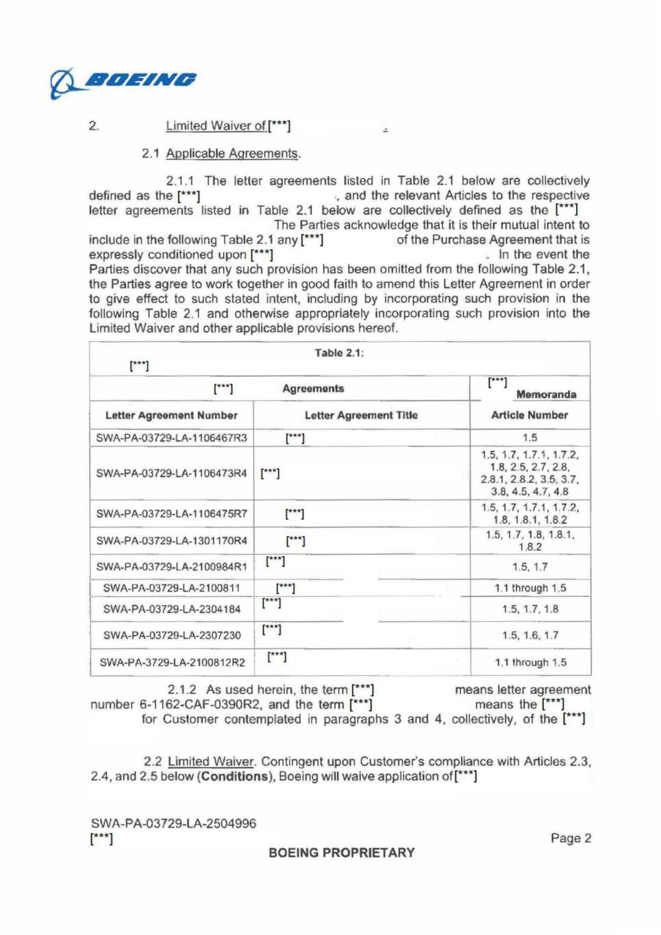 ?It__APOW,Af4d7 2. Limited Waiver of[***] 2.1 Applicable Agreements. 2.1.1 The letter agreements listed in Table 2.1 below are collectively defined as the [*1 , and the relevant Articles to the respective letter agreements listed in Table 2.1 below are collectively defined as the [***] The Parties acknowledge that it is their mutual intent to include in the following Table 2.1 any [***] of the Purchase Agreement that is expressly conditioned upon [***] . In the event the Parties discover that any such provision has been omitted from the following Table 2.1, the Parties agree to work together in good faith to amend this Letter Agreement in order to give effect to such stated intent, including by incorporating such provision in the following Table 2.1 and otherwise appropriately incorporating such provision into the Limited Waiver and other applicable provisions hereof. Letter Agreement Number Table 2.1: Agreements Letter Agreement Title SWA-PA-03729-LA-1106467R3 SWA-PA-03729-LA-1106473R4 Memoranda Article Number 1.5 1.5, 1.7, 1.7.1, 1.7,2, 1.8, 2.5, 2.7, 2,8, 2.8.1, 2.8.2, 3.5, 3.7, 3.8, 4.5, 4.7, 4.8 SWA-PA-03729-LA-1106475R7 SWA-PA-03729-LA-1301170R4 SWA-PA-03729-LA-2100984R1 1.5, 1.7, 1.7.1, 1.7.2, 1.8. 1.8.1, 1.6.2 1.5, 1.7, 1.8, 1.8.1, 1.8.2 r SWA-PA-03729-LA-2100811 SWA-PA-03729-LA-2304184 SWA-PA-03729-LA-2307230 SWA-PA-3729-LA-2100812R2 1.5,1.7 1.1 through 1.5 1 5, 1.7, 1.8 1.5, 1.6,1.7 1,1 through 1 5 2.1.2 As used herein, the term [**1 means letter agreement number 6-1162-CAF-0390R2, and the term ["*] means the [*1 for Customer contemplated in paragraphs 3 and 4, collectively, of the [***] 2.2 Limited Waiver. Contingent upon Customer's compliance with Articles 2.3, 2.4, and 2.5 below (Conditions), Boeing will waive application of[***] SWA-PA-03729-LA-2504996 [**1 Page 2 BOEING PROPRIETARY