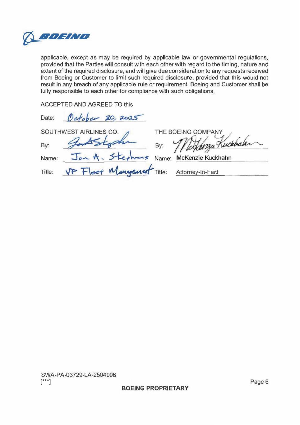 01_4,0E/Afar applicable, except as may be required by applicable law or governmental regulations, provided that the Parties will consult with each other with regard to the timing, nature and extent of the required disclosure, and will give due consideration to any requests received from Boeing or Customer to limit such required disclosure, provided that this would not result in any breach of any applicable rule or requirement. Boeing and Customer shall be fully responsible to each other for compliance with such obligations. ACCEPTED AND AGREED TO this Date: , 61844p SOUTHWEST AIRLINES CO. By: Name: Title: rt qtz. 'Flee+ Vt4.0k THE BOEING COMPANY / By: Name: McKenzie Kuckhahn Title: Attorney-In-Fact SWA-PA-03729-LA-2504996 [***1 Page 6 BOEING PROPRIETARY