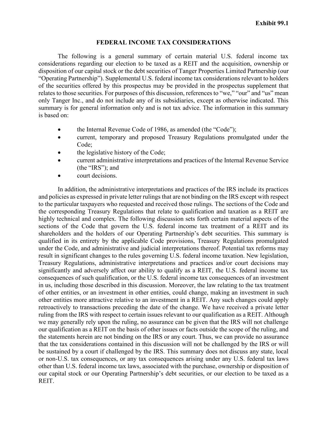 Exhibit 99.1 FEDERAL INCOME TAX CONSIDERATIONS The following is a general summary of certain material U.S. federal income tax considerations regarding our election to be taxed as a REIT and the acquisition, ownership or disposition of our capital stock or the debt securities of Tanger Properties Limited Partnership (our “Operating Partnership”). Supplemental U.S. federal income tax considerations relevant to holders of the securities offered by this prospectus may be provided in the prospectus supplement that relates to those securities. For purposes of this discussion, references to “we,” “our” and “us” mean only Tanger Inc., and do not include any of its subsidiaries, except as otherwise indicated. This summary is for general information only and is not tax advice. The information in this summary is based on: • the Internal Revenue Code of 1986, as amended (the “Code”); • current, temporary and proposed Treasury Regulations promulgated under the Code; • the legislative history of the Code; • current administrative interpretations and practices of the Internal Revenue Service (the “IRS”); and • court decisions. In addition, the administrative interpretations and practices of the IRS include its practices and policies as expressed in private letter rulings that are not binding on the IRS except with respect to the particular taxpayers who requested and received those rulings. The sections of the Code and the corresponding Treasury Regulations that relate to qualification and taxation as a REIT are highly technical and complex. The following discussion sets forth certain material aspects of the sections of the Code that govern the U.S. federal income tax treatment of a REIT and its shareholders and the holders of our Operating Partnership’s debt securities. This summary is qualified in its entirety by the applicable Code provisions, Treasury Regulations promulgated under the Code, and administrative and judicial interpretations thereof. Potential tax reforms may result in significant changes to the rules governing U.S. federal income taxation. New legislation, Treasury Regulations, administrative interpretations and practices and/or court decisions may significantly and adversely affect our ability to qualify as a REIT, the U.S. federal income tax consequences of such qualification, or the U.S. federal income tax consequences of an investment in us, including those described in this discussion. Moreover, the law relating to the tax treatment of other entities, or an investment in other entities, could change, making an investment in such other entities more attractive relative to an investment in a REIT. Any such changes could apply retroactively to transactions preceding the date of the change. We have received a private letter ruling from the IRS with respect to certain issues relevant to our qualification as a REIT. Although we may generally rely upon the ruling, no assurance can be given that the IRS will not challenge our qualification as a REIT on the basis of other issues or facts outside the scope of the ruling, and the statements herein are not binding on the IRS or any court. Thus, we can provide no assurance that the tax considerations contained in this discussion will not be challenged by the IRS or will be sustained by a court if challenged by the IRS. This summary does not discuss any state, local or non-U.S. tax consequences, or any tax consequences arising under any U.S. federal tax laws other than U.S. federal income tax laws, associated with the purchase, ownership or disposition of our capital stock or our Operating Partnership’s debt securities, or our election to be taxed as a REIT.