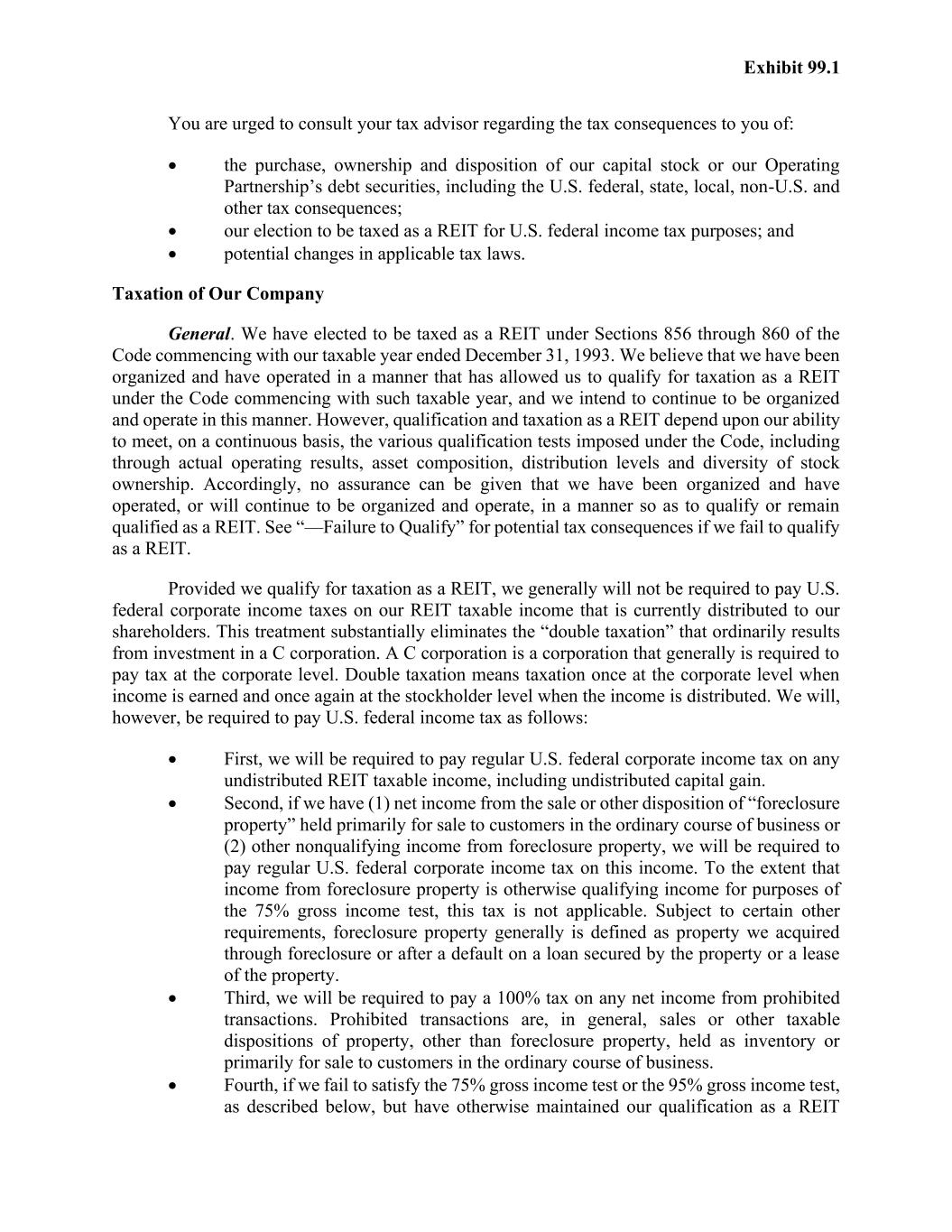 Exhibit 99.1 You are urged to consult your tax advisor regarding the tax consequences to you of: • the purchase, ownership and disposition of our capital stock or our Operating Partnership’s debt securities, including the U.S. federal, state, local, non-U.S. and other tax consequences; • our election to be taxed as a REIT for U.S. federal income tax purposes; and • potential changes in applicable tax laws. Taxation of Our Company General. We have elected to be taxed as a REIT under Sections 856 through 860 of the Code commencing with our taxable year ended December 31, 1993. We believe that we have been organized and have operated in a manner that has allowed us to qualify for taxation as a REIT under the Code commencing with such taxable year, and we intend to continue to be organized and operate in this manner. However, qualification and taxation as a REIT depend upon our ability to meet, on a continuous basis, the various qualification tests imposed under the Code, including through actual operating results, asset composition, distribution levels and diversity of stock ownership. Accordingly, no assurance can be given that we have been organized and have operated, or will continue to be organized and operate, in a manner so as to qualify or remain qualified as a REIT. See “—Failure to Qualify” for potential tax consequences if we fail to qualify as a REIT. Provided we qualify for taxation as a REIT, we generally will not be required to pay U.S. federal corporate income taxes on our REIT taxable income that is currently distributed to our shareholders. This treatment substantially eliminates the “double taxation” that ordinarily results from investment in a C corporation. A C corporation is a corporation that generally is required to pay tax at the corporate level. Double taxation means taxation once at the corporate level when income is earned and once again at the stockholder level when the income is distributed. We will, however, be required to pay U.S. federal income tax as follows: • First, we will be required to pay regular U.S. federal corporate income tax on any undistributed REIT taxable income, including undistributed capital gain. • Second, if we have (1) net income from the sale or other disposition of “foreclosure property” held primarily for sale to customers in the ordinary course of business or (2) other nonqualifying income from foreclosure property, we will be required to pay regular U.S. federal corporate income tax on this income. To the extent that income from foreclosure property is otherwise qualifying income for purposes of the 75% gross income test, this tax is not applicable. Subject to certain other requirements, foreclosure property generally is defined as property we acquired through foreclosure or after a default on a loan secured by the property or a lease of the property. • Third, we will be required to pay a 100% tax on any net income from prohibited transactions. Prohibited transactions are, in general, sales or other taxable dispositions of property, other than foreclosure property, held as inventory or primarily for sale to customers in the ordinary course of business. • Fourth, if we fail to satisfy the 75% gross income test or the 95% gross income test, as described below, but have otherwise maintained our qualification as a REIT