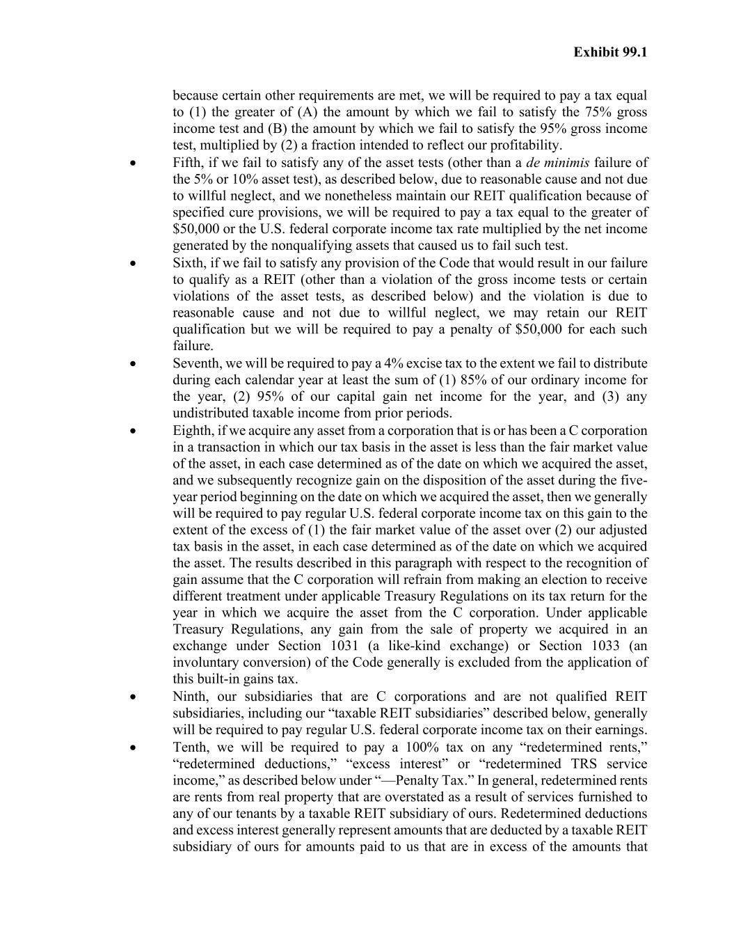 Exhibit 99.1 because certain other requirements are met, we will be required to pay a tax equal to (1) the greater of (A) the amount by which we fail to satisfy the 75% gross income test and (B) the amount by which we fail to satisfy the 95% gross income test, multiplied by (2) a fraction intended to reflect our profitability. • Fifth, if we fail to satisfy any of the asset tests (other than a de minimis failure of the 5% or 10% asset test), as described below, due to reasonable cause and not due to willful neglect, and we nonetheless maintain our REIT qualification because of specified cure provisions, we will be required to pay a tax equal to the greater of $50,000 or the U.S. federal corporate income tax rate multiplied by the net income generated by the nonqualifying assets that caused us to fail such test. • Sixth, if we fail to satisfy any provision of the Code that would result in our failure to qualify as a REIT (other than a violation of the gross income tests or certain violations of the asset tests, as described below) and the violation is due to reasonable cause and not due to willful neglect, we may retain our REIT qualification but we will be required to pay a penalty of $50,000 for each such failure. • Seventh, we will be required to pay a 4% excise tax to the extent we fail to distribute during each calendar year at least the sum of (1) 85% of our ordinary income for the year, (2) 95% of our capital gain net income for the year, and (3) any undistributed taxable income from prior periods. • Eighth, if we acquire any asset from a corporation that is or has been a C corporation in a transaction in which our tax basis in the asset is less than the fair market value of the asset, in each case determined as of the date on which we acquired the asset, and we subsequently recognize gain on the disposition of the asset during the five- year period beginning on the date on which we acquired the asset, then we generally will be required to pay regular U.S. federal corporate income tax on this gain to the extent of the excess of (1) the fair market value of the asset over (2) our adjusted tax basis in the asset, in each case determined as of the date on which we acquired the asset. The results described in this paragraph with respect to the recognition of gain assume that the C corporation will refrain from making an election to receive different treatment under applicable Treasury Regulations on its tax return for the year in which we acquire the asset from the C corporation. Under applicable Treasury Regulations, any gain from the sale of property we acquired in an exchange under Section 1031 (a like-kind exchange) or Section 1033 (an involuntary conversion) of the Code generally is excluded from the application of this built-in gains tax. • Ninth, our subsidiaries that are C corporations and are not qualified REIT subsidiaries, including our “taxable REIT subsidiaries” described below, generally will be required to pay regular U.S. federal corporate income tax on their earnings. • Tenth, we will be required to pay a 100% tax on any “redetermined rents,” “redetermined deductions,” “excess interest” or “redetermined TRS service income,” as described below under “—Penalty Tax.” In general, redetermined rents are rents from real property that are overstated as a result of services furnished to any of our tenants by a taxable REIT subsidiary of ours. Redetermined deductions and excess interest generally represent amounts that are deducted by a taxable REIT subsidiary of ours for amounts paid to us that are in excess of the amounts that