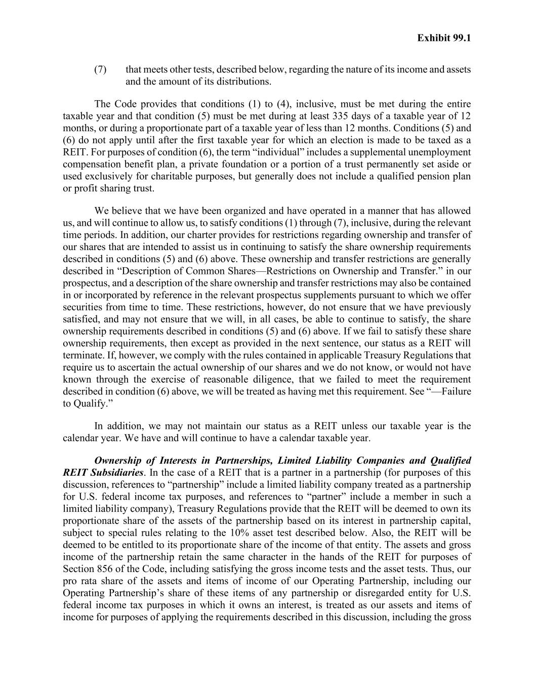 Exhibit 99.1 (7) that meets other tests, described below, regarding the nature of its income and assets and the amount of its distributions. The Code provides that conditions (1) to (4), inclusive, must be met during the entire taxable year and that condition (5) must be met during at least 335 days of a taxable year of 12 months, or during a proportionate part of a taxable year of less than 12 months. Conditions (5) and (6) do not apply until after the first taxable year for which an election is made to be taxed as a REIT. For purposes of condition (6), the term “individual” includes a supplemental unemployment compensation benefit plan, a private foundation or a portion of a trust permanently set aside or used exclusively for charitable purposes, but generally does not include a qualified pension plan or profit sharing trust. We believe that we have been organized and have operated in a manner that has allowed us, and will continue to allow us, to satisfy conditions (1) through (7), inclusive, during the relevant time periods. In addition, our charter provides for restrictions regarding ownership and transfer of our shares that are intended to assist us in continuing to satisfy the share ownership requirements described in conditions (5) and (6) above. These ownership and transfer restrictions are generally described in “Description of Common Shares—Restrictions on Ownership and Transfer.” in our prospectus, and a description of the share ownership and transfer restrictions may also be contained in or incorporated by reference in the relevant prospectus supplements pursuant to which we offer securities from time to time. These restrictions, however, do not ensure that we have previously satisfied, and may not ensure that we will, in all cases, be able to continue to satisfy, the share ownership requirements described in conditions (5) and (6) above. If we fail to satisfy these share ownership requirements, then except as provided in the next sentence, our status as a REIT will terminate. If, however, we comply with the rules contained in applicable Treasury Regulations that require us to ascertain the actual ownership of our shares and we do not know, or would not have known through the exercise of reasonable diligence, that we failed to meet the requirement described in condition (6) above, we will be treated as having met this requirement. See “—Failure to Qualify.” In addition, we may not maintain our status as a REIT unless our taxable year is the calendar year. We have and will continue to have a calendar taxable year. Ownership of Interests in Partnerships, Limited Liability Companies and Qualified REIT Subsidiaries. In the case of a REIT that is a partner in a partnership (for purposes of this discussion, references to “partnership” include a limited liability company treated as a partnership for U.S. federal income tax purposes, and references to “partner” include a member in such a limited liability company), Treasury Regulations provide that the REIT will be deemed to own its proportionate share of the assets of the partnership based on its interest in partnership capital, subject to special rules relating to the 10% asset test described below. Also, the REIT will be deemed to be entitled to its proportionate share of the income of that entity. The assets and gross income of the partnership retain the same character in the hands of the REIT for purposes of Section 856 of the Code, including satisfying the gross income tests and the asset tests. Thus, our pro rata share of the assets and items of income of our Operating Partnership, including our Operating Partnership’s share of these items of any partnership or disregarded entity for U.S. federal income tax purposes in which it owns an interest, is treated as our assets and items of income for purposes of applying the requirements described in this discussion, including the gross