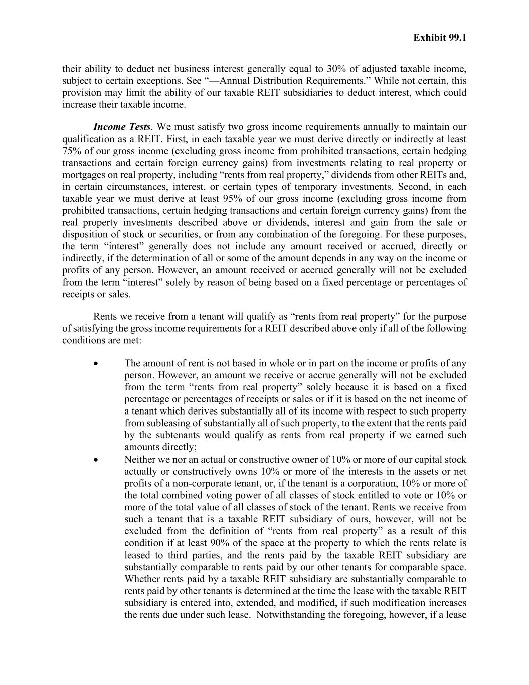 Exhibit 99.1 their ability to deduct net business interest generally equal to 30% of adjusted taxable income, subject to certain exceptions. See “—Annual Distribution Requirements.” While not certain, this provision may limit the ability of our taxable REIT subsidiaries to deduct interest, which could increase their taxable income. Income Tests. We must satisfy two gross income requirements annually to maintain our qualification as a REIT. First, in each taxable year we must derive directly or indirectly at least 75% of our gross income (excluding gross income from prohibited transactions, certain hedging transactions and certain foreign currency gains) from investments relating to real property or mortgages on real property, including “rents from real property,” dividends from other REITs and, in certain circumstances, interest, or certain types of temporary investments. Second, in each taxable year we must derive at least 95% of our gross income (excluding gross income from prohibited transactions, certain hedging transactions and certain foreign currency gains) from the real property investments described above or dividends, interest and gain from the sale or disposition of stock or securities, or from any combination of the foregoing. For these purposes, the term “interest” generally does not include any amount received or accrued, directly or indirectly, if the determination of all or some of the amount depends in any way on the income or profits of any person. However, an amount received or accrued generally will not be excluded from the term “interest” solely by reason of being based on a fixed percentage or percentages of receipts or sales. Rents we receive from a tenant will qualify as “rents from real property” for the purpose of satisfying the gross income requirements for a REIT described above only if all of the following conditions are met: • The amount of rent is not based in whole or in part on the income or profits of any person. However, an amount we receive or accrue generally will not be excluded from the term “rents from real property” solely because it is based on a fixed percentage or percentages of receipts or sales or if it is based on the net income of a tenant which derives substantially all of its income with respect to such property from subleasing of substantially all of such property, to the extent that the rents paid by the subtenants would qualify as rents from real property if we earned such amounts directly; • Neither we nor an actual or constructive owner of 10% or more of our capital stock actually or constructively owns 10% or more of the interests in the assets or net profits of a non-corporate tenant, or, if the tenant is a corporation, 10% or more of the total combined voting power of all classes of stock entitled to vote or 10% or more of the total value of all classes of stock of the tenant. Rents we receive from such a tenant that is a taxable REIT subsidiary of ours, however, will not be excluded from the definition of “rents from real property” as a result of this condition if at least 90% of the space at the property to which the rents relate is leased to third parties, and the rents paid by the taxable REIT subsidiary are substantially comparable to rents paid by our other tenants for comparable space. Whether rents paid by a taxable REIT subsidiary are substantially comparable to rents paid by other tenants is determined at the time the lease with the taxable REIT subsidiary is entered into, extended, and modified, if such modification increases the rents due under such lease. Notwithstanding the foregoing, however, if a lease
