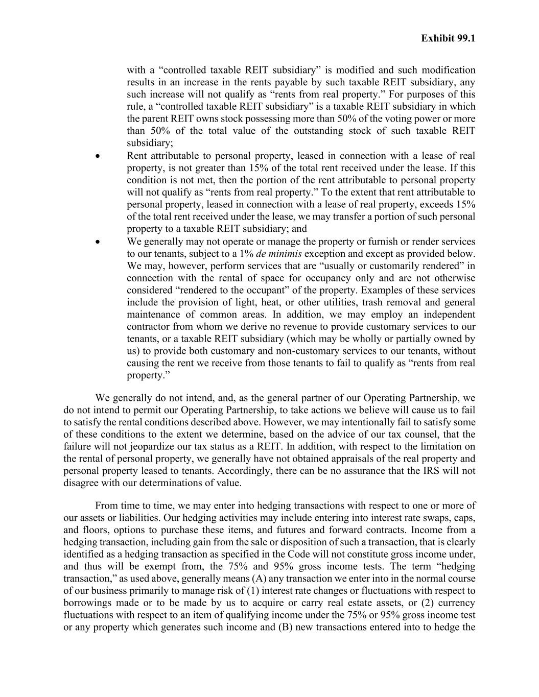 Exhibit 99.1 with a “controlled taxable REIT subsidiary” is modified and such modification results in an increase in the rents payable by such taxable REIT subsidiary, any such increase will not qualify as “rents from real property.” For purposes of this rule, a “controlled taxable REIT subsidiary” is a taxable REIT subsidiary in which the parent REIT owns stock possessing more than 50% of the voting power or more than 50% of the total value of the outstanding stock of such taxable REIT subsidiary; • Rent attributable to personal property, leased in connection with a lease of real property, is not greater than 15% of the total rent received under the lease. If this condition is not met, then the portion of the rent attributable to personal property will not qualify as “rents from real property.” To the extent that rent attributable to personal property, leased in connection with a lease of real property, exceeds 15% of the total rent received under the lease, we may transfer a portion of such personal property to a taxable REIT subsidiary; and • We generally may not operate or manage the property or furnish or render services to our tenants, subject to a 1% de minimis exception and except as provided below. We may, however, perform services that are “usually or customarily rendered” in connection with the rental of space for occupancy only and are not otherwise considered “rendered to the occupant” of the property. Examples of these services include the provision of light, heat, or other utilities, trash removal and general maintenance of common areas. In addition, we may employ an independent contractor from whom we derive no revenue to provide customary services to our tenants, or a taxable REIT subsidiary (which may be wholly or partially owned by us) to provide both customary and non-customary services to our tenants, without causing the rent we receive from those tenants to fail to qualify as “rents from real property.” We generally do not intend, and, as the general partner of our Operating Partnership, we do not intend to permit our Operating Partnership, to take actions we believe will cause us to fail to satisfy the rental conditions described above. However, we may intentionally fail to satisfy some of these conditions to the extent we determine, based on the advice of our tax counsel, that the failure will not jeopardize our tax status as a REIT. In addition, with respect to the limitation on the rental of personal property, we generally have not obtained appraisals of the real property and personal property leased to tenants. Accordingly, there can be no assurance that the IRS will not disagree with our determinations of value. From time to time, we may enter into hedging transactions with respect to one or more of our assets or liabilities. Our hedging activities may include entering into interest rate swaps, caps, and floors, options to purchase these items, and futures and forward contracts. Income from a hedging transaction, including gain from the sale or disposition of such a transaction, that is clearly identified as a hedging transaction as specified in the Code will not constitute gross income under, and thus will be exempt from, the 75% and 95% gross income tests. The term “hedging transaction,” as used above, generally means (A) any transaction we enter into in the normal course of our business primarily to manage risk of (1) interest rate changes or fluctuations with respect to borrowings made or to be made by us to acquire or carry real estate assets, or (2) currency fluctuations with respect to an item of qualifying income under the 75% or 95% gross income test or any property which generates such income and (B) new transactions entered into to hedge the