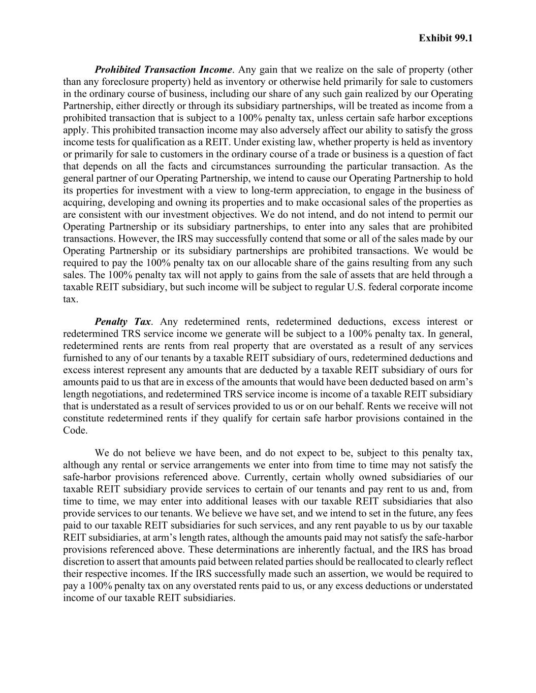 Exhibit 99.1 Prohibited Transaction Income. Any gain that we realize on the sale of property (other than any foreclosure property) held as inventory or otherwise held primarily for sale to customers in the ordinary course of business, including our share of any such gain realized by our Operating Partnership, either directly or through its subsidiary partnerships, will be treated as income from a prohibited transaction that is subject to a 100% penalty tax, unless certain safe harbor exceptions apply. This prohibited transaction income may also adversely affect our ability to satisfy the gross income tests for qualification as a REIT. Under existing law, whether property is held as inventory or primarily for sale to customers in the ordinary course of a trade or business is a question of fact that depends on all the facts and circumstances surrounding the particular transaction. As the general partner of our Operating Partnership, we intend to cause our Operating Partnership to hold its properties for investment with a view to long-term appreciation, to engage in the business of acquiring, developing and owning its properties and to make occasional sales of the properties as are consistent with our investment objectives. We do not intend, and do not intend to permit our Operating Partnership or its subsidiary partnerships, to enter into any sales that are prohibited transactions. However, the IRS may successfully contend that some or all of the sales made by our Operating Partnership or its subsidiary partnerships are prohibited transactions. We would be required to pay the 100% penalty tax on our allocable share of the gains resulting from any such sales. The 100% penalty tax will not apply to gains from the sale of assets that are held through a taxable REIT subsidiary, but such income will be subject to regular U.S. federal corporate income tax. Penalty Tax. Any redetermined rents, redetermined deductions, excess interest or redetermined TRS service income we generate will be subject to a 100% penalty tax. In general, redetermined rents are rents from real property that are overstated as a result of any services furnished to any of our tenants by a taxable REIT subsidiary of ours, redetermined deductions and excess interest represent any amounts that are deducted by a taxable REIT subsidiary of ours for amounts paid to us that are in excess of the amounts that would have been deducted based on arm’s length negotiations, and redetermined TRS service income is income of a taxable REIT subsidiary that is understated as a result of services provided to us or on our behalf. Rents we receive will not constitute redetermined rents if they qualify for certain safe harbor provisions contained in the Code. We do not believe we have been, and do not expect to be, subject to this penalty tax, although any rental or service arrangements we enter into from time to time may not satisfy the safe-harbor provisions referenced above. Currently, certain wholly owned subsidiaries of our taxable REIT subsidiary provide services to certain of our tenants and pay rent to us and, from time to time, we may enter into additional leases with our taxable REIT subsidiaries that also provide services to our tenants. We believe we have set, and we intend to set in the future, any fees paid to our taxable REIT subsidiaries for such services, and any rent payable to us by our taxable REIT subsidiaries, at arm’s length rates, although the amounts paid may not satisfy the safe-harbor provisions referenced above. These determinations are inherently factual, and the IRS has broad discretion to assert that amounts paid between related parties should be reallocated to clearly reflect their respective incomes. If the IRS successfully made such an assertion, we would be required to pay a 100% penalty tax on any overstated rents paid to us, or any excess deductions or understated income of our taxable REIT subsidiaries.