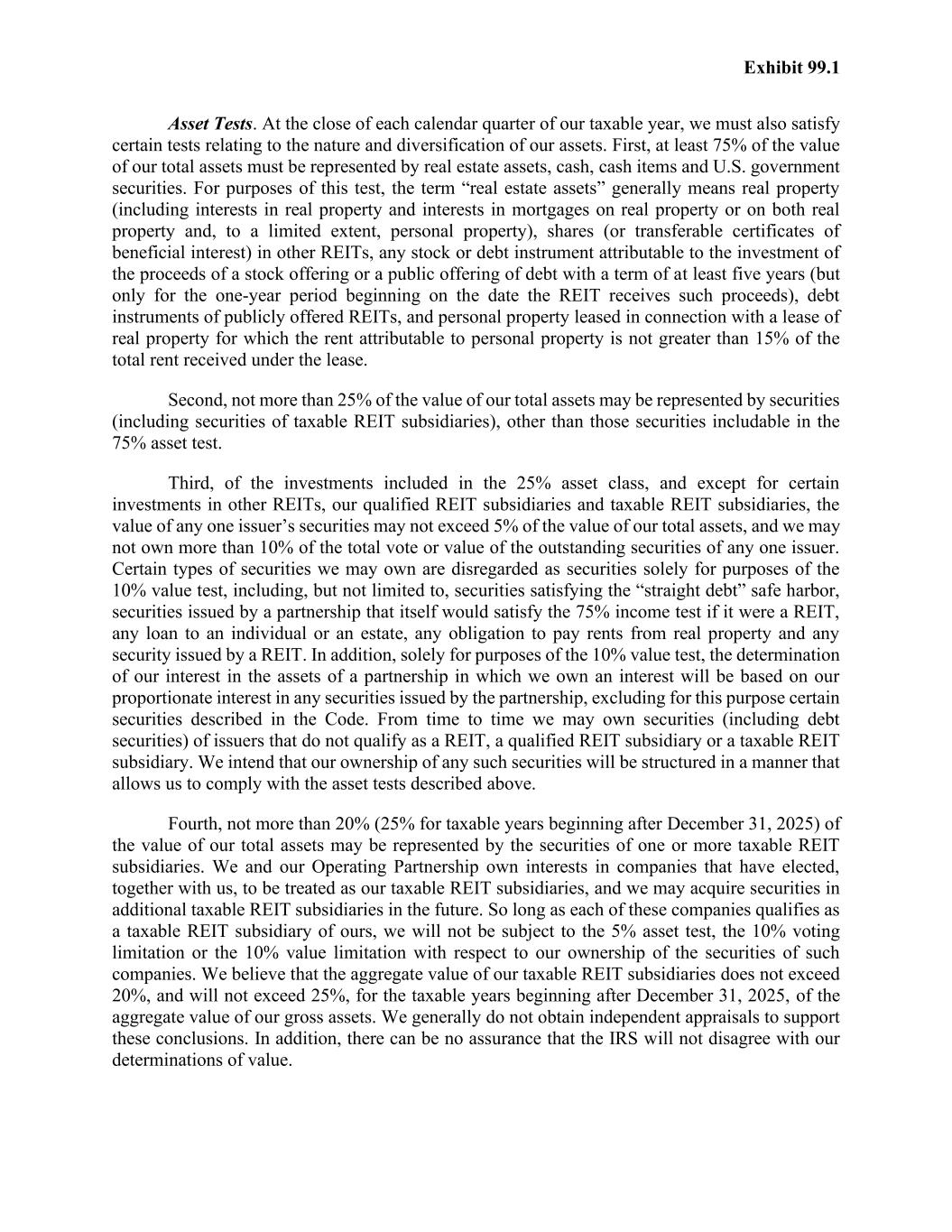 Exhibit 99.1 Asset Tests. At the close of each calendar quarter of our taxable year, we must also satisfy certain tests relating to the nature and diversification of our assets. First, at least 75% of the value of our total assets must be represented by real estate assets, cash, cash items and U.S. government securities. For purposes of this test, the term “real estate assets” generally means real property (including interests in real property and interests in mortgages on real property or on both real property and, to a limited extent, personal property), shares (or transferable certificates of beneficial interest) in other REITs, any stock or debt instrument attributable to the investment of the proceeds of a stock offering or a public offering of debt with a term of at least five years (but only for the one-year period beginning on the date the REIT receives such proceeds), debt instruments of publicly offered REITs, and personal property leased in connection with a lease of real property for which the rent attributable to personal property is not greater than 15% of the total rent received under the lease. Second, not more than 25% of the value of our total assets may be represented by securities (including securities of taxable REIT subsidiaries), other than those securities includable in the 75% asset test. Third, of the investments included in the 25% asset class, and except for certain investments in other REITs, our qualified REIT subsidiaries and taxable REIT subsidiaries, the value of any one issuer’s securities may not exceed 5% of the value of our total assets, and we may not own more than 10% of the total vote or value of the outstanding securities of any one issuer. Certain types of securities we may own are disregarded as securities solely for purposes of the 10% value test, including, but not limited to, securities satisfying the “straight debt” safe harbor, securities issued by a partnership that itself would satisfy the 75% income test if it were a REIT, any loan to an individual or an estate, any obligation to pay rents from real property and any security issued by a REIT. In addition, solely for purposes of the 10% value test, the determination of our interest in the assets of a partnership in which we own an interest will be based on our proportionate interest in any securities issued by the partnership, excluding for this purpose certain securities described in the Code. From time to time we may own securities (including debt securities) of issuers that do not qualify as a REIT, a qualified REIT subsidiary or a taxable REIT subsidiary. We intend that our ownership of any such securities will be structured in a manner that allows us to comply with the asset tests described above. Fourth, not more than 20% (25% for taxable years beginning after December 31, 2025) of the value of our total assets may be represented by the securities of one or more taxable REIT subsidiaries. We and our Operating Partnership own interests in companies that have elected, together with us, to be treated as our taxable REIT subsidiaries, and we may acquire securities in additional taxable REIT subsidiaries in the future. So long as each of these companies qualifies as a taxable REIT subsidiary of ours, we will not be subject to the 5% asset test, the 10% voting limitation or the 10% value limitation with respect to our ownership of the securities of such companies. We believe that the aggregate value of our taxable REIT subsidiaries does not exceed 20%, and will not exceed 25%, for the taxable years beginning after December 31, 2025, of the aggregate value of our gross assets. We generally do not obtain independent appraisals to support these conclusions. In addition, there can be no assurance that the IRS will not disagree with our determinations of value.