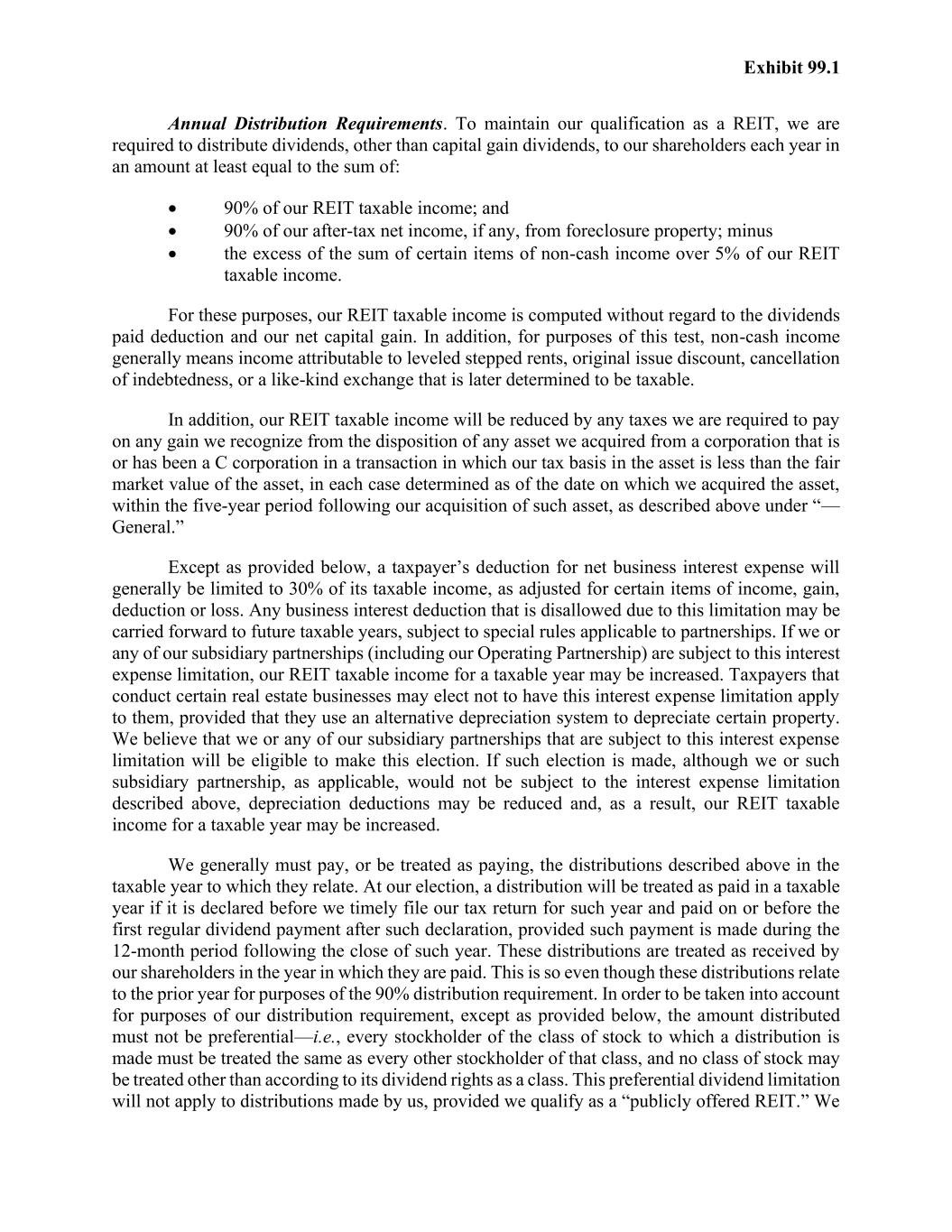 Exhibit 99.1 Annual Distribution Requirements. To maintain our qualification as a REIT, we are required to distribute dividends, other than capital gain dividends, to our shareholders each year in an amount at least equal to the sum of: • 90% of our REIT taxable income; and • 90% of our after-tax net income, if any, from foreclosure property; minus • the excess of the sum of certain items of non-cash income over 5% of our REIT taxable income. For these purposes, our REIT taxable income is computed without regard to the dividends paid deduction and our net capital gain. In addition, for purposes of this test, non-cash income generally means income attributable to leveled stepped rents, original issue discount, cancellation of indebtedness, or a like-kind exchange that is later determined to be taxable. In addition, our REIT taxable income will be reduced by any taxes we are required to pay on any gain we recognize from the disposition of any asset we acquired from a corporation that is or has been a C corporation in a transaction in which our tax basis in the asset is less than the fair market value of the asset, in each case determined as of the date on which we acquired the asset, within the five-year period following our acquisition of such asset, as described above under “— General.” Except as provided below, a taxpayer’s deduction for net business interest expense will generally be limited to 30% of its taxable income, as adjusted for certain items of income, gain, deduction or loss. Any business interest deduction that is disallowed due to this limitation may be carried forward to future taxable years, subject to special rules applicable to partnerships. If we or any of our subsidiary partnerships (including our Operating Partnership) are subject to this interest expense limitation, our REIT taxable income for a taxable year may be increased. Taxpayers that conduct certain real estate businesses may elect not to have this interest expense limitation apply to them, provided that they use an alternative depreciation system to depreciate certain property. We believe that we or any of our subsidiary partnerships that are subject to this interest expense limitation will be eligible to make this election. If such election is made, although we or such subsidiary partnership, as applicable, would not be subject to the interest expense limitation described above, depreciation deductions may be reduced and, as a result, our REIT taxable income for a taxable year may be increased. We generally must pay, or be treated as paying, the distributions described above in the taxable year to which they relate. At our election, a distribution will be treated as paid in a taxable year if it is declared before we timely file our tax return for such year and paid on or before the first regular dividend payment after such declaration, provided such payment is made during the 12-month period following the close of such year. These distributions are treated as received by our shareholders in the year in which they are paid. This is so even though these distributions relate to the prior year for purposes of the 90% distribution requirement. In order to be taken into account for purposes of our distribution requirement, except as provided below, the amount distributed must not be preferential—i.e., every stockholder of the class of stock to which a distribution is made must be treated the same as every other stockholder of that class, and no class of stock may be treated other than according to its dividend rights as a class. This preferential dividend limitation will not apply to distributions made by us, provided we qualify as a “publicly offered REIT.” We