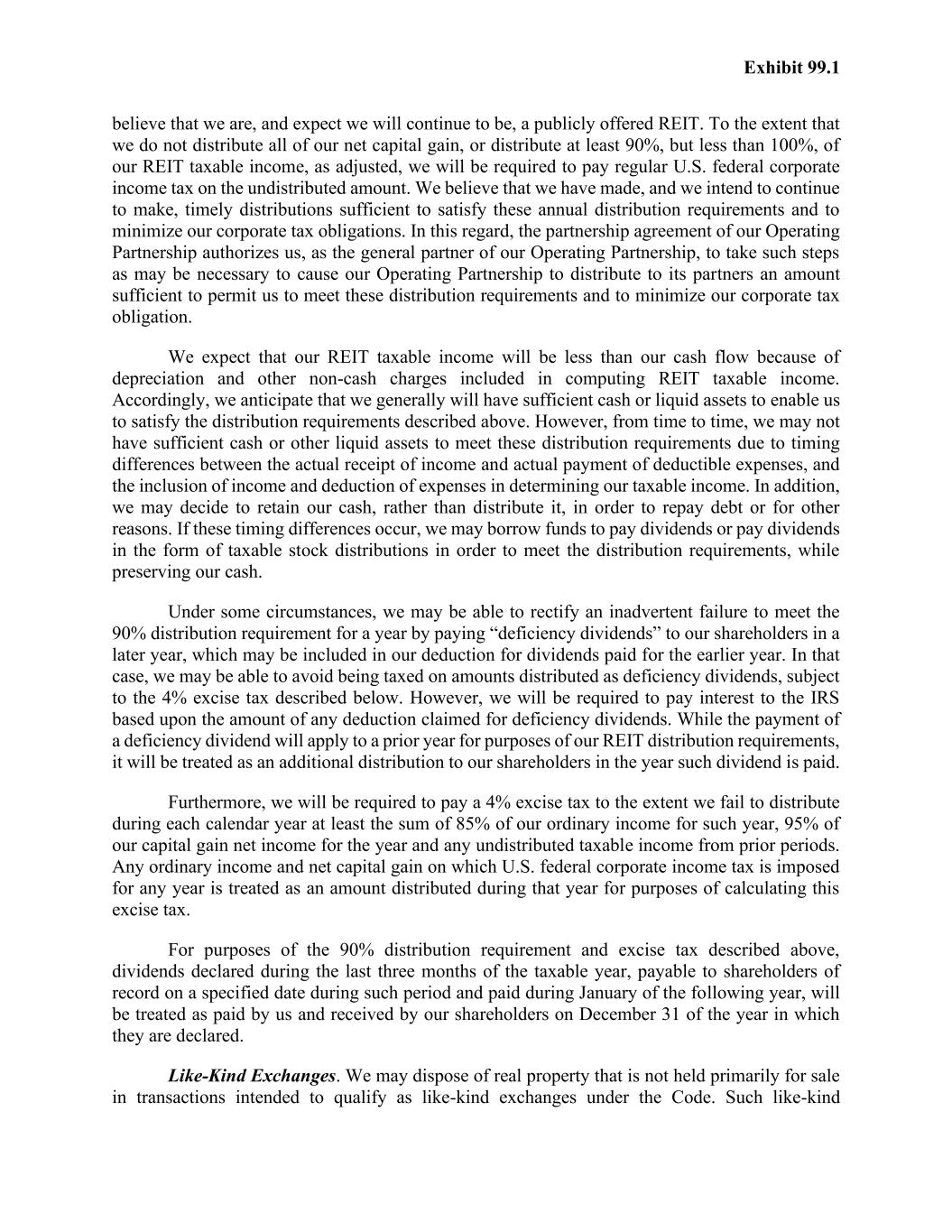 Exhibit 99.1 believe that we are, and expect we will continue to be, a publicly offered REIT. To the extent that we do not distribute all of our net capital gain, or distribute at least 90%, but less than 100%, of our REIT taxable income, as adjusted, we will be required to pay regular U.S. federal corporate income tax on the undistributed amount. We believe that we have made, and we intend to continue to make, timely distributions sufficient to satisfy these annual distribution requirements and to minimize our corporate tax obligations. In this regard, the partnership agreement of our Operating Partnership authorizes us, as the general partner of our Operating Partnership, to take such steps as may be necessary to cause our Operating Partnership to distribute to its partners an amount sufficient to permit us to meet these distribution requirements and to minimize our corporate tax obligation. We expect that our REIT taxable income will be less than our cash flow because of depreciation and other non-cash charges included in computing REIT taxable income. Accordingly, we anticipate that we generally will have sufficient cash or liquid assets to enable us to satisfy the distribution requirements described above. However, from time to time, we may not have sufficient cash or other liquid assets to meet these distribution requirements due to timing differences between the actual receipt of income and actual payment of deductible expenses, and the inclusion of income and deduction of expenses in determining our taxable income. In addition, we may decide to retain our cash, rather than distribute it, in order to repay debt or for other reasons. If these timing differences occur, we may borrow funds to pay dividends or pay dividends in the form of taxable stock distributions in order to meet the distribution requirements, while preserving our cash. Under some circumstances, we may be able to rectify an inadvertent failure to meet the 90% distribution requirement for a year by paying “deficiency dividends” to our shareholders in a later year, which may be included in our deduction for dividends paid for the earlier year. In that case, we may be able to avoid being taxed on amounts distributed as deficiency dividends, subject to the 4% excise tax described below. However, we will be required to pay interest to the IRS based upon the amount of any deduction claimed for deficiency dividends. While the payment of a deficiency dividend will apply to a prior year for purposes of our REIT distribution requirements, it will be treated as an additional distribution to our shareholders in the year such dividend is paid. Furthermore, we will be required to pay a 4% excise tax to the extent we fail to distribute during each calendar year at least the sum of 85% of our ordinary income for such year, 95% of our capital gain net income for the year and any undistributed taxable income from prior periods. Any ordinary income and net capital gain on which U.S. federal corporate income tax is imposed for any year is treated as an amount distributed during that year for purposes of calculating this excise tax. For purposes of the 90% distribution requirement and excise tax described above, dividends declared during the last three months of the taxable year, payable to shareholders of record on a specified date during such period and paid during January of the following year, will be treated as paid by us and received by our shareholders on December 31 of the year in which they are declared. Like-Kind Exchanges. We may dispose of real property that is not held primarily for sale in transactions intended to qualify as like-kind exchanges under the Code. Such like-kind