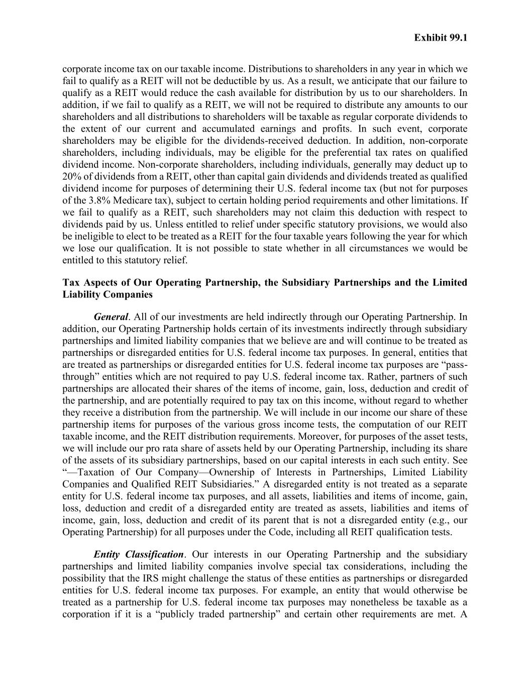 Exhibit 99.1 corporate income tax on our taxable income. Distributions to shareholders in any year in which we fail to qualify as a REIT will not be deductible by us. As a result, we anticipate that our failure to qualify as a REIT would reduce the cash available for distribution by us to our shareholders. In addition, if we fail to qualify as a REIT, we will not be required to distribute any amounts to our shareholders and all distributions to shareholders will be taxable as regular corporate dividends to the extent of our current and accumulated earnings and profits. In such event, corporate shareholders may be eligible for the dividends-received deduction. In addition, non-corporate shareholders, including individuals, may be eligible for the preferential tax rates on qualified dividend income. Non-corporate shareholders, including individuals, generally may deduct up to 20% of dividends from a REIT, other than capital gain dividends and dividends treated as qualified dividend income for purposes of determining their U.S. federal income tax (but not for purposes of the 3.8% Medicare tax), subject to certain holding period requirements and other limitations. If we fail to qualify as a REIT, such shareholders may not claim this deduction with respect to dividends paid by us. Unless entitled to relief under specific statutory provisions, we would also be ineligible to elect to be treated as a REIT for the four taxable years following the year for which we lose our qualification. It is not possible to state whether in all circumstances we would be entitled to this statutory relief. Tax Aspects of Our Operating Partnership, the Subsidiary Partnerships and the Limited Liability Companies General. All of our investments are held indirectly through our Operating Partnership. In addition, our Operating Partnership holds certain of its investments indirectly through subsidiary partnerships and limited liability companies that we believe are and will continue to be treated as partnerships or disregarded entities for U.S. federal income tax purposes. In general, entities that are treated as partnerships or disregarded entities for U.S. federal income tax purposes are “pass- through” entities which are not required to pay U.S. federal income tax. Rather, partners of such partnerships are allocated their shares of the items of income, gain, loss, deduction and credit of the partnership, and are potentially required to pay tax on this income, without regard to whether they receive a distribution from the partnership. We will include in our income our share of these partnership items for purposes of the various gross income tests, the computation of our REIT taxable income, and the REIT distribution requirements. Moreover, for purposes of the asset tests, we will include our pro rata share of assets held by our Operating Partnership, including its share of the assets of its subsidiary partnerships, based on our capital interests in each such entity. See “—Taxation of Our Company—Ownership of Interests in Partnerships, Limited Liability Companies and Qualified REIT Subsidiaries.” A disregarded entity is not treated as a separate entity for U.S. federal income tax purposes, and all assets, liabilities and items of income, gain, loss, deduction and credit of a disregarded entity are treated as assets, liabilities and items of income, gain, loss, deduction and credit of its parent that is not a disregarded entity (e.g., our Operating Partnership) for all purposes under the Code, including all REIT qualification tests. Entity Classification. Our interests in our Operating Partnership and the subsidiary partnerships and limited liability companies involve special tax considerations, including the possibility that the IRS might challenge the status of these entities as partnerships or disregarded entities for U.S. federal income tax purposes. For example, an entity that would otherwise be treated as a partnership for U.S. federal income tax purposes may nonetheless be taxable as a corporation if it is a “publicly traded partnership” and certain other requirements are met. A