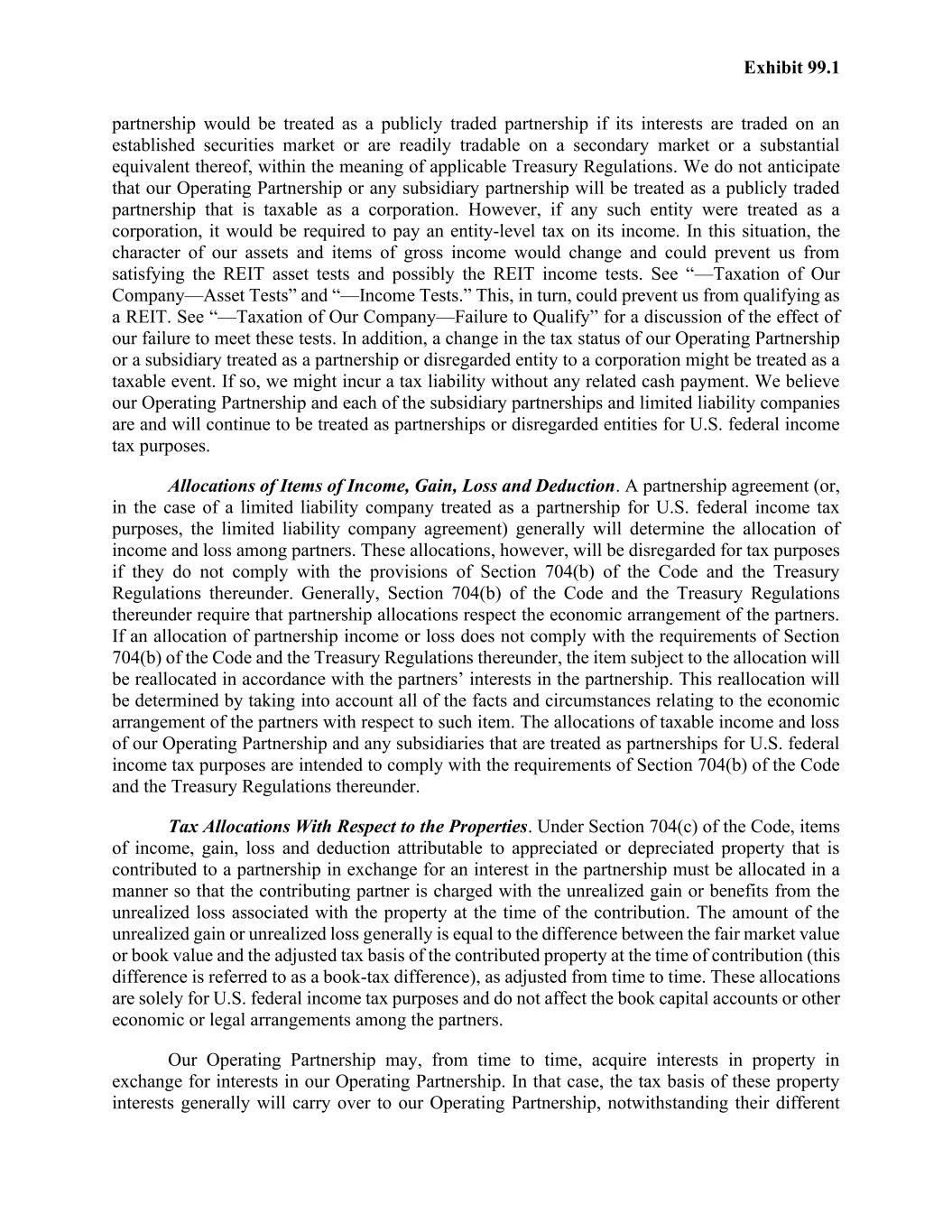 Exhibit 99.1 partnership would be treated as a publicly traded partnership if its interests are traded on an established securities market or are readily tradable on a secondary market or a substantial equivalent thereof, within the meaning of applicable Treasury Regulations. We do not anticipate that our Operating Partnership or any subsidiary partnership will be treated as a publicly traded partnership that is taxable as a corporation. However, if any such entity were treated as a corporation, it would be required to pay an entity-level tax on its income. In this situation, the character of our assets and items of gross income would change and could prevent us from satisfying the REIT asset tests and possibly the REIT income tests. See “—Taxation of Our Company—Asset Tests” and “—Income Tests.” This, in turn, could prevent us from qualifying as a REIT. See “—Taxation of Our Company—Failure to Qualify” for a discussion of the effect of our failure to meet these tests. In addition, a change in the tax status of our Operating Partnership or a subsidiary treated as a partnership or disregarded entity to a corporation might be treated as a taxable event. If so, we might incur a tax liability without any related cash payment. We believe our Operating Partnership and each of the subsidiary partnerships and limited liability companies are and will continue to be treated as partnerships or disregarded entities for U.S. federal income tax purposes. Allocations of Items of Income, Gain, Loss and Deduction. A partnership agreement (or, in the case of a limited liability company treated as a partnership for U.S. federal income tax purposes, the limited liability company agreement) generally will determine the allocation of income and loss among partners. These allocations, however, will be disregarded for tax purposes if they do not comply with the provisions of Section 704(b) of the Code and the Treasury Regulations thereunder. Generally, Section 704(b) of the Code and the Treasury Regulations thereunder require that partnership allocations respect the economic arrangement of the partners. If an allocation of partnership income or loss does not comply with the requirements of Section 704(b) of the Code and the Treasury Regulations thereunder, the item subject to the allocation will be reallocated in accordance with the partners’ interests in the partnership. This reallocation will be determined by taking into account all of the facts and circumstances relating to the economic arrangement of the partners with respect to such item. The allocations of taxable income and loss of our Operating Partnership and any subsidiaries that are treated as partnerships for U.S. federal income tax purposes are intended to comply with the requirements of Section 704(b) of the Code and the Treasury Regulations thereunder. Tax Allocations With Respect to the Properties. Under Section 704(c) of the Code, items of income, gain, loss and deduction attributable to appreciated or depreciated property that is contributed to a partnership in exchange for an interest in the partnership must be allocated in a manner so that the contributing partner is charged with the unrealized gain or benefits from the unrealized loss associated with the property at the time of the contribution. The amount of the unrealized gain or unrealized loss generally is equal to the difference between the fair market value or book value and the adjusted tax basis of the contributed property at the time of contribution (this difference is referred to as a book-tax difference), as adjusted from time to time. These allocations are solely for U.S. federal income tax purposes and do not affect the book capital accounts or other economic or legal arrangements among the partners. Our Operating Partnership may, from time to time, acquire interests in property in exchange for interests in our Operating Partnership. In that case, the tax basis of these property interests generally will carry over to our Operating Partnership, notwithstanding their different