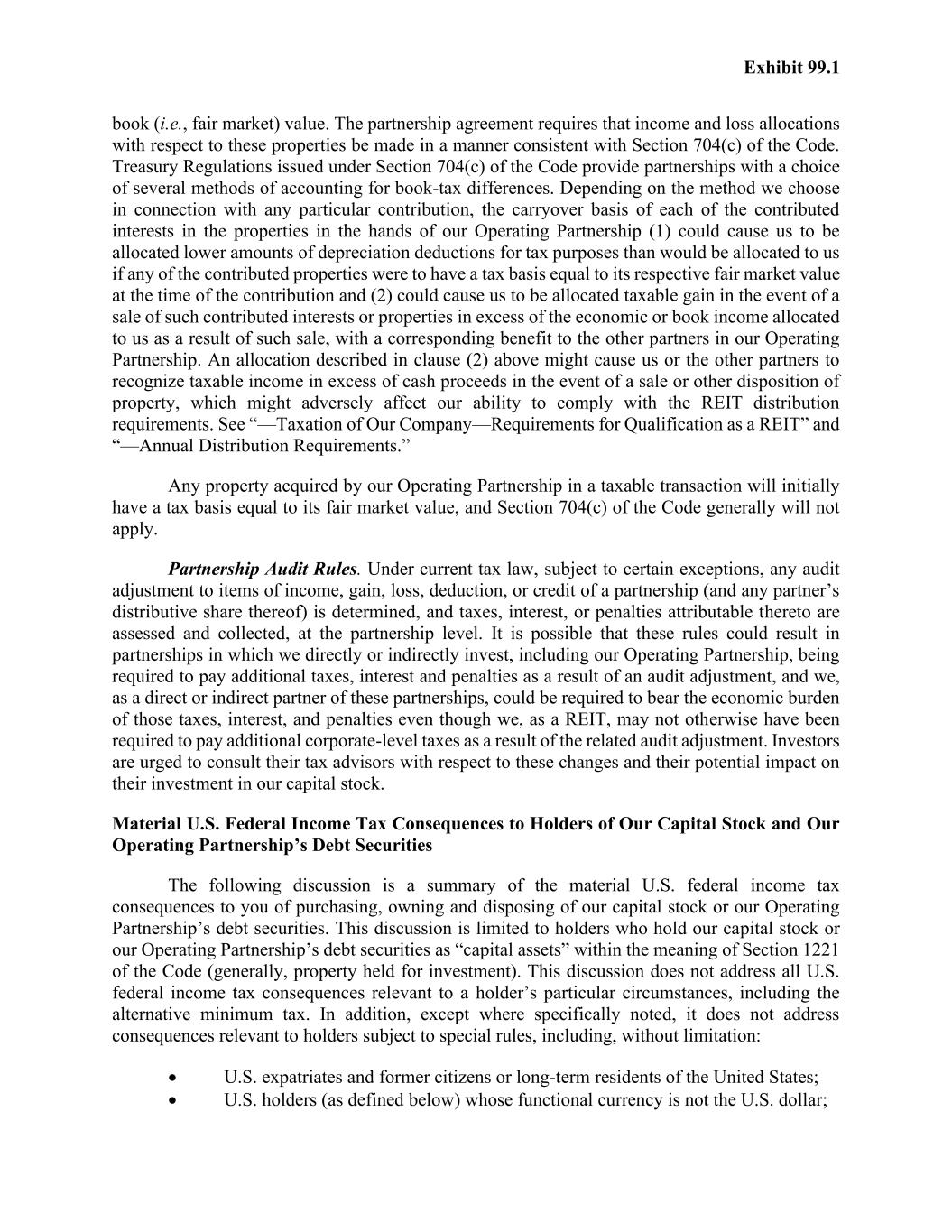 Exhibit 99.1 book (i.e., fair market) value. The partnership agreement requires that income and loss allocations with respect to these properties be made in a manner consistent with Section 704(c) of the Code. Treasury Regulations issued under Section 704(c) of the Code provide partnerships with a choice of several methods of accounting for book-tax differences. Depending on the method we choose in connection with any particular contribution, the carryover basis of each of the contributed interests in the properties in the hands of our Operating Partnership (1) could cause us to be allocated lower amounts of depreciation deductions for tax purposes than would be allocated to us if any of the contributed properties were to have a tax basis equal to its respective fair market value at the time of the contribution and (2) could cause us to be allocated taxable gain in the event of a sale of such contributed interests or properties in excess of the economic or book income allocated to us as a result of such sale, with a corresponding benefit to the other partners in our Operating Partnership. An allocation described in clause (2) above might cause us or the other partners to recognize taxable income in excess of cash proceeds in the event of a sale or other disposition of property, which might adversely affect our ability to comply with the REIT distribution requirements. See “—Taxation of Our Company—Requirements for Qualification as a REIT” and “—Annual Distribution Requirements.” Any property acquired by our Operating Partnership in a taxable transaction will initially have a tax basis equal to its fair market value, and Section 704(c) of the Code generally will not apply. Partnership Audit Rules. Under current tax law, subject to certain exceptions, any audit adjustment to items of income, gain, loss, deduction, or credit of a partnership (and any partner’s distributive share thereof) is determined, and taxes, interest, or penalties attributable thereto are assessed and collected, at the partnership level. It is possible that these rules could result in partnerships in which we directly or indirectly invest, including our Operating Partnership, being required to pay additional taxes, interest and penalties as a result of an audit adjustment, and we, as a direct or indirect partner of these partnerships, could be required to bear the economic burden of those taxes, interest, and penalties even though we, as a REIT, may not otherwise have been required to pay additional corporate-level taxes as a result of the related audit adjustment. Investors are urged to consult their tax advisors with respect to these changes and their potential impact on their investment in our capital stock. Material U.S. Federal Income Tax Consequences to Holders of Our Capital Stock and Our Operating Partnership’s Debt Securities The following discussion is a summary of the material U.S. federal income tax consequences to you of purchasing, owning and disposing of our capital stock or our Operating Partnership’s debt securities. This discussion is limited to holders who hold our capital stock or our Operating Partnership’s debt securities as “capital assets” within the meaning of Section 1221 of the Code (generally, property held for investment). This discussion does not address all U.S. federal income tax consequences relevant to a holder’s particular circumstances, including the alternative minimum tax. In addition, except where specifically noted, it does not address consequences relevant to holders subject to special rules, including, without limitation: • U.S. expatriates and former citizens or long-term residents of the United States; • U.S. holders (as defined below) whose functional currency is not the U.S. dollar;