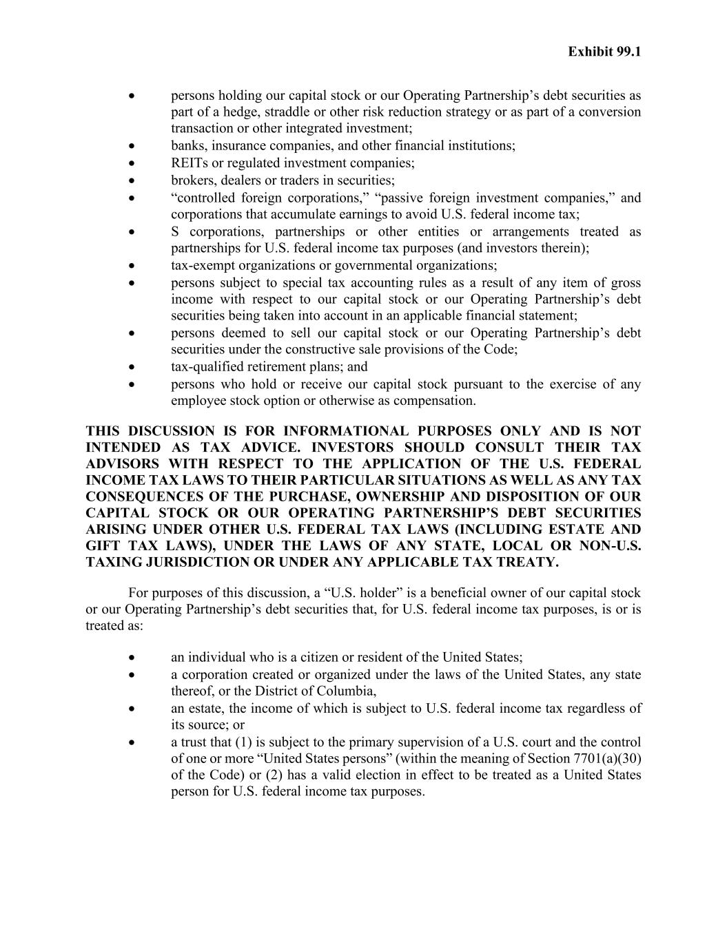 Exhibit 99.1 • persons holding our capital stock or our Operating Partnership’s debt securities as part of a hedge, straddle or other risk reduction strategy or as part of a conversion transaction or other integrated investment; • banks, insurance companies, and other financial institutions; • REITs or regulated investment companies; • brokers, dealers or traders in securities; • “controlled foreign corporations,” “passive foreign investment companies,” and corporations that accumulate earnings to avoid U.S. federal income tax; • S corporations, partnerships or other entities or arrangements treated as partnerships for U.S. federal income tax purposes (and investors therein); • tax-exempt organizations or governmental organizations; • persons subject to special tax accounting rules as a result of any item of gross income with respect to our capital stock or our Operating Partnership’s debt securities being taken into account in an applicable financial statement; • persons deemed to sell our capital stock or our Operating Partnership’s debt securities under the constructive sale provisions of the Code; • tax-qualified retirement plans; and • persons who hold or receive our capital stock pursuant to the exercise of any employee stock option or otherwise as compensation. THIS DISCUSSION IS FOR INFORMATIONAL PURPOSES ONLY AND IS NOT INTENDED AS TAX ADVICE. INVESTORS SHOULD CONSULT THEIR TAX ADVISORS WITH RESPECT TO THE APPLICATION OF THE U.S. FEDERAL INCOME TAX LAWS TO THEIR PARTICULAR SITUATIONS AS WELL AS ANY TAX CONSEQUENCES OF THE PURCHASE, OWNERSHIP AND DISPOSITION OF OUR CAPITAL STOCK OR OUR OPERATING PARTNERSHIP’S DEBT SECURITIES ARISING UNDER OTHER U.S. FEDERAL TAX LAWS (INCLUDING ESTATE AND GIFT TAX LAWS), UNDER THE LAWS OF ANY STATE, LOCAL OR NON-U.S. TAXING JURISDICTION OR UNDER ANY APPLICABLE TAX TREATY. For purposes of this discussion, a “U.S. holder” is a beneficial owner of our capital stock or our Operating Partnership’s debt securities that, for U.S. federal income tax purposes, is or is treated as: • an individual who is a citizen or resident of the United States; • a corporation created or organized under the laws of the United States, any state thereof, or the District of Columbia, • an estate, the income of which is subject to U.S. federal income tax regardless of its source; or • a trust that (1) is subject to the primary supervision of a U.S. court and the control of one or more “United States persons” (within the meaning of Section 7701(a)(30) of the Code) or (2) has a valid election in effect to be treated as a United States person for U.S. federal income tax purposes.
