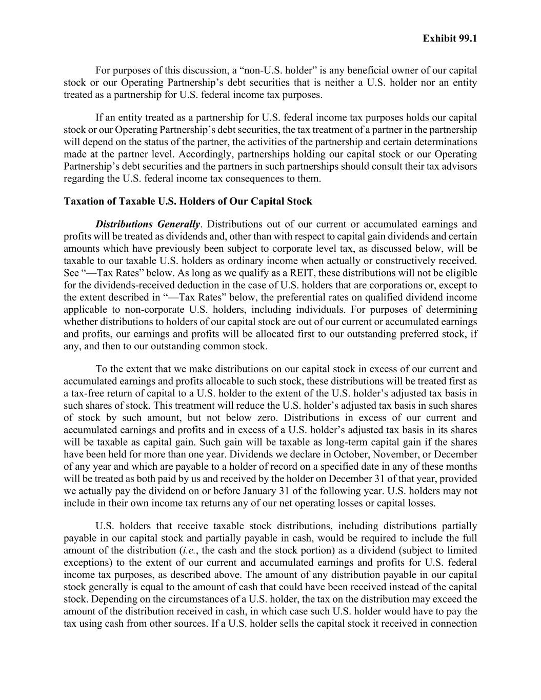 Exhibit 99.1 For purposes of this discussion, a “non-U.S. holder” is any beneficial owner of our capital stock or our Operating Partnership’s debt securities that is neither a U.S. holder nor an entity treated as a partnership for U.S. federal income tax purposes. If an entity treated as a partnership for U.S. federal income tax purposes holds our capital stock or our Operating Partnership’s debt securities, the tax treatment of a partner in the partnership will depend on the status of the partner, the activities of the partnership and certain determinations made at the partner level. Accordingly, partnerships holding our capital stock or our Operating Partnership’s debt securities and the partners in such partnerships should consult their tax advisors regarding the U.S. federal income tax consequences to them. Taxation of Taxable U.S. Holders of Our Capital Stock Distributions Generally. Distributions out of our current or accumulated earnings and profits will be treated as dividends and, other than with respect to capital gain dividends and certain amounts which have previously been subject to corporate level tax, as discussed below, will be taxable to our taxable U.S. holders as ordinary income when actually or constructively received. See “—Tax Rates” below. As long as we qualify as a REIT, these distributions will not be eligible for the dividends-received deduction in the case of U.S. holders that are corporations or, except to the extent described in “—Tax Rates” below, the preferential rates on qualified dividend income applicable to non-corporate U.S. holders, including individuals. For purposes of determining whether distributions to holders of our capital stock are out of our current or accumulated earnings and profits, our earnings and profits will be allocated first to our outstanding preferred stock, if any, and then to our outstanding common stock. To the extent that we make distributions on our capital stock in excess of our current and accumulated earnings and profits allocable to such stock, these distributions will be treated first as a tax-free return of capital to a U.S. holder to the extent of the U.S. holder’s adjusted tax basis in such shares of stock. This treatment will reduce the U.S. holder’s adjusted tax basis in such shares of stock by such amount, but not below zero. Distributions in excess of our current and accumulated earnings and profits and in excess of a U.S. holder’s adjusted tax basis in its shares will be taxable as capital gain. Such gain will be taxable as long-term capital gain if the shares have been held for more than one year. Dividends we declare in October, November, or December of any year and which are payable to a holder of record on a specified date in any of these months will be treated as both paid by us and received by the holder on December 31 of that year, provided we actually pay the dividend on or before January 31 of the following year. U.S. holders may not include in their own income tax returns any of our net operating losses or capital losses. U.S. holders that receive taxable stock distributions, including distributions partially payable in our capital stock and partially payable in cash, would be required to include the full amount of the distribution (i.e., the cash and the stock portion) as a dividend (subject to limited exceptions) to the extent of our current and accumulated earnings and profits for U.S. federal income tax purposes, as described above. The amount of any distribution payable in our capital stock generally is equal to the amount of cash that could have been received instead of the capital stock. Depending on the circumstances of a U.S. holder, the tax on the distribution may exceed the amount of the distribution received in cash, in which case such U.S. holder would have to pay the tax using cash from other sources. If a U.S. holder sells the capital stock it received in connection
