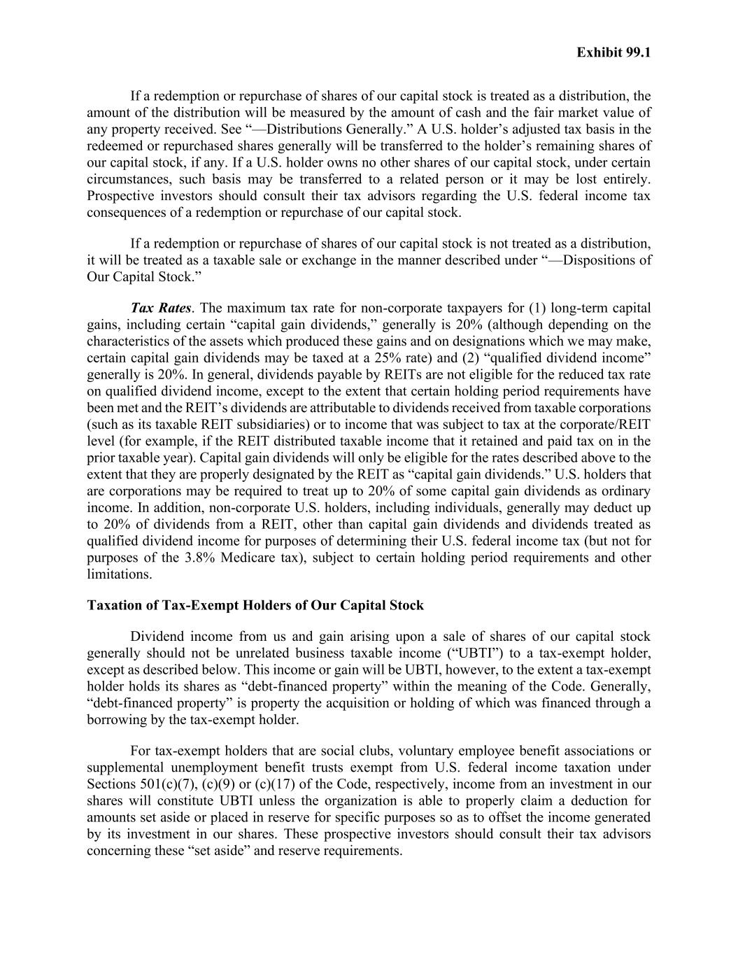 Exhibit 99.1 If a redemption or repurchase of shares of our capital stock is treated as a distribution, the amount of the distribution will be measured by the amount of cash and the fair market value of any property received. See “—Distributions Generally.” A U.S. holder’s adjusted tax basis in the redeemed or repurchased shares generally will be transferred to the holder’s remaining shares of our capital stock, if any. If a U.S. holder owns no other shares of our capital stock, under certain circumstances, such basis may be transferred to a related person or it may be lost entirely. Prospective investors should consult their tax advisors regarding the U.S. federal income tax consequences of a redemption or repurchase of our capital stock. If a redemption or repurchase of shares of our capital stock is not treated as a distribution, it will be treated as a taxable sale or exchange in the manner described under “—Dispositions of Our Capital Stock.” Tax Rates. The maximum tax rate for non-corporate taxpayers for (1) long-term capital gains, including certain “capital gain dividends,” generally is 20% (although depending on the characteristics of the assets which produced these gains and on designations which we may make, certain capital gain dividends may be taxed at a 25% rate) and (2) “qualified dividend income” generally is 20%. In general, dividends payable by REITs are not eligible for the reduced tax rate on qualified dividend income, except to the extent that certain holding period requirements have been met and the REIT’s dividends are attributable to dividends received from taxable corporations (such as its taxable REIT subsidiaries) or to income that was subject to tax at the corporate/REIT level (for example, if the REIT distributed taxable income that it retained and paid tax on in the prior taxable year). Capital gain dividends will only be eligible for the rates described above to the extent that they are properly designated by the REIT as “capital gain dividends.” U.S. holders that are corporations may be required to treat up to 20% of some capital gain dividends as ordinary income. In addition, non-corporate U.S. holders, including individuals, generally may deduct up to 20% of dividends from a REIT, other than capital gain dividends and dividends treated as qualified dividend income for purposes of determining their U.S. federal income tax (but not for purposes of the 3.8% Medicare tax), subject to certain holding period requirements and other limitations. Taxation of Tax-Exempt Holders of Our Capital Stock Dividend income from us and gain arising upon a sale of shares of our capital stock generally should not be unrelated business taxable income (“UBTI”) to a tax-exempt holder, except as described below. This income or gain will be UBTI, however, to the extent a tax-exempt holder holds its shares as “debt-financed property” within the meaning of the Code. Generally, “debt-financed property” is property the acquisition or holding of which was financed through a borrowing by the tax-exempt holder. For tax-exempt holders that are social clubs, voluntary employee benefit associations or supplemental unemployment benefit trusts exempt from U.S. federal income taxation under Sections 501(c)(7), (c)(9) or (c)(17) of the Code, respectively, income from an investment in our shares will constitute UBTI unless the organization is able to properly claim a deduction for amounts set aside or placed in reserve for specific purposes so as to offset the income generated by its investment in our shares. These prospective investors should consult their tax advisors concerning these “set aside” and reserve requirements.