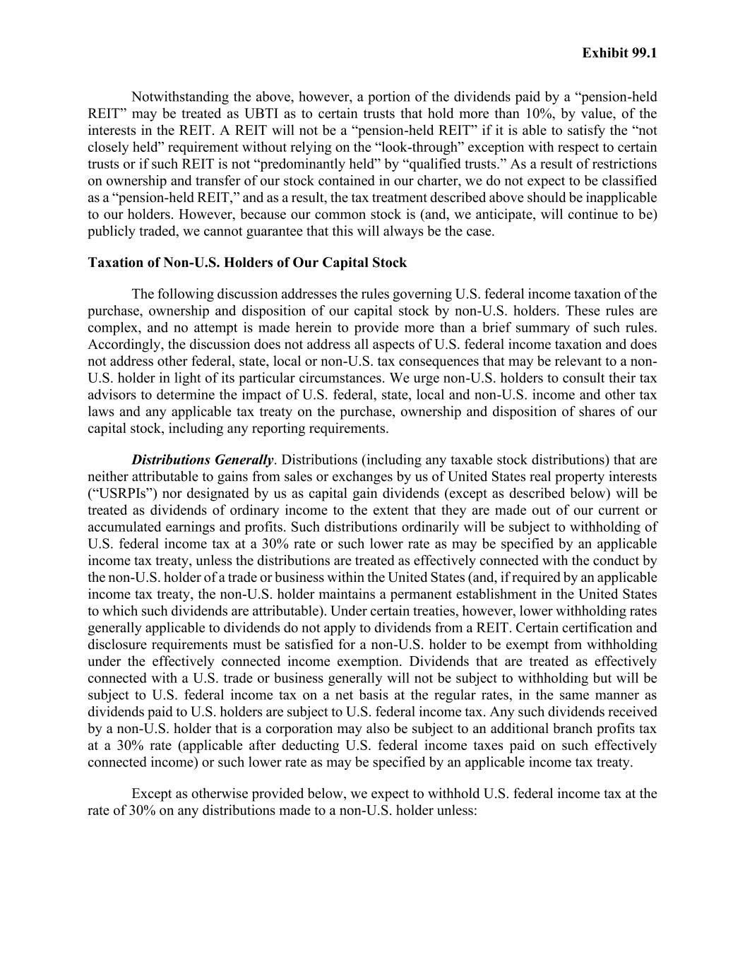 Exhibit 99.1 Notwithstanding the above, however, a portion of the dividends paid by a “pension-held REIT” may be treated as UBTI as to certain trusts that hold more than 10%, by value, of the interests in the REIT. A REIT will not be a “pension-held REIT” if it is able to satisfy the “not closely held” requirement without relying on the “look-through” exception with respect to certain trusts or if such REIT is not “predominantly held” by “qualified trusts.” As a result of restrictions on ownership and transfer of our stock contained in our charter, we do not expect to be classified as a “pension-held REIT,” and as a result, the tax treatment described above should be inapplicable to our holders. However, because our common stock is (and, we anticipate, will continue to be) publicly traded, we cannot guarantee that this will always be the case. Taxation of Non-U.S. Holders of Our Capital Stock The following discussion addresses the rules governing U.S. federal income taxation of the purchase, ownership and disposition of our capital stock by non-U.S. holders. These rules are complex, and no attempt is made herein to provide more than a brief summary of such rules. Accordingly, the discussion does not address all aspects of U.S. federal income taxation and does not address other federal, state, local or non-U.S. tax consequences that may be relevant to a non- U.S. holder in light of its particular circumstances. We urge non-U.S. holders to consult their tax advisors to determine the impact of U.S. federal, state, local and non-U.S. income and other tax laws and any applicable tax treaty on the purchase, ownership and disposition of shares of our capital stock, including any reporting requirements. Distributions Generally. Distributions (including any taxable stock distributions) that are neither attributable to gains from sales or exchanges by us of United States real property interests (“USRPIs”) nor designated by us as capital gain dividends (except as described below) will be treated as dividends of ordinary income to the extent that they are made out of our current or accumulated earnings and profits. Such distributions ordinarily will be subject to withholding of U.S. federal income tax at a 30% rate or such lower rate as may be specified by an applicable income tax treaty, unless the distributions are treated as effectively connected with the conduct by the non-U.S. holder of a trade or business within the United States (and, if required by an applicable income tax treaty, the non-U.S. holder maintains a permanent establishment in the United States to which such dividends are attributable). Under certain treaties, however, lower withholding rates generally applicable to dividends do not apply to dividends from a REIT. Certain certification and disclosure requirements must be satisfied for a non-U.S. holder to be exempt from withholding under the effectively connected income exemption. Dividends that are treated as effectively connected with a U.S. trade or business generally will not be subject to withholding but will be subject to U.S. federal income tax on a net basis at the regular rates, in the same manner as dividends paid to U.S. holders are subject to U.S. federal income tax. Any such dividends received by a non-U.S. holder that is a corporation may also be subject to an additional branch profits tax at a 30% rate (applicable after deducting U.S. federal income taxes paid on such effectively connected income) or such lower rate as may be specified by an applicable income tax treaty. Except as otherwise provided below, we expect to withhold U.S. federal income tax at the rate of 30% on any distributions made to a non-U.S. holder unless: