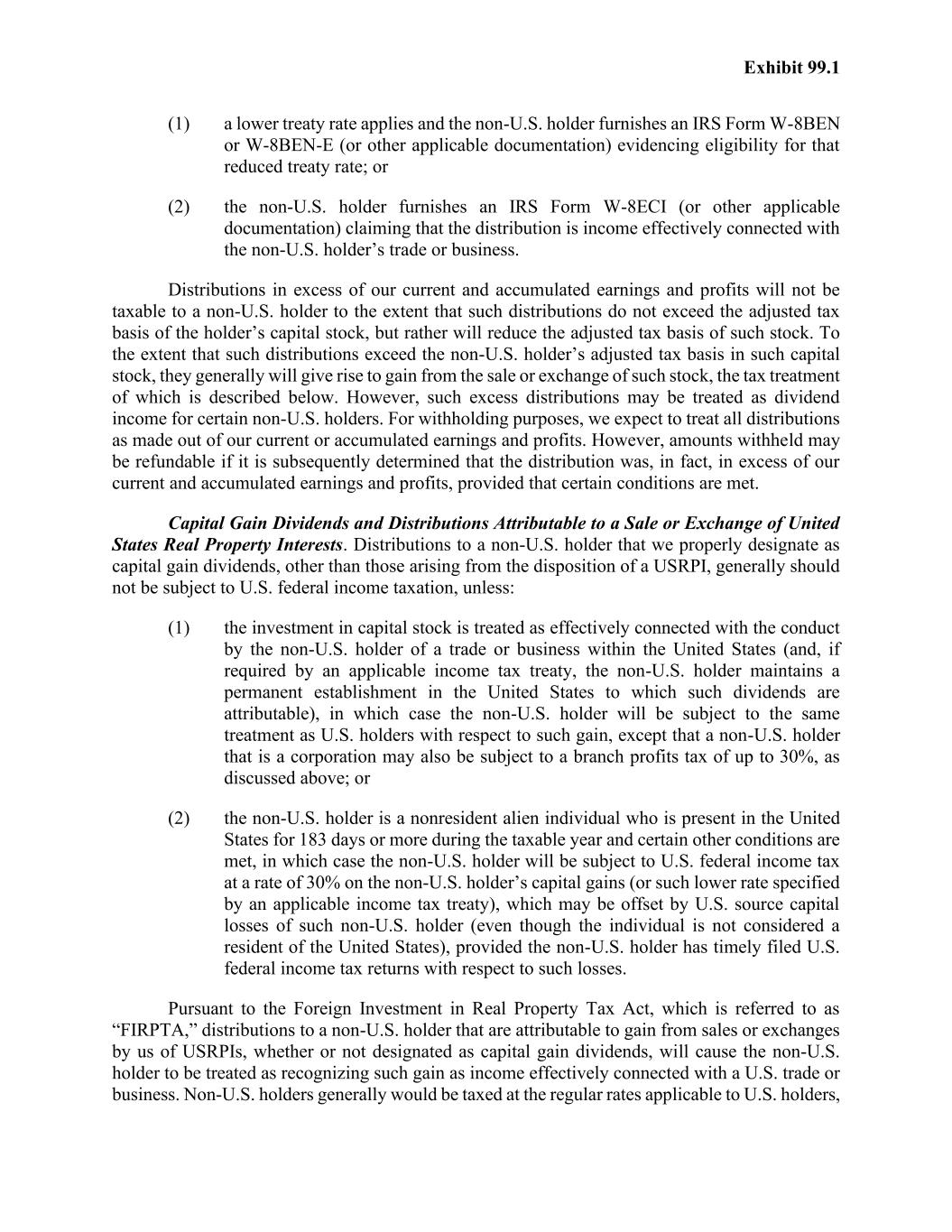 Exhibit 99.1 (1) a lower treaty rate applies and the non-U.S. holder furnishes an IRS Form W-8BEN or W-8BEN-E (or other applicable documentation) evidencing eligibility for that reduced treaty rate; or (2) the non-U.S. holder furnishes an IRS Form W-8ECI (or other applicable documentation) claiming that the distribution is income effectively connected with the non-U.S. holder’s trade or business. Distributions in excess of our current and accumulated earnings and profits will not be taxable to a non-U.S. holder to the extent that such distributions do not exceed the adjusted tax basis of the holder’s capital stock, but rather will reduce the adjusted tax basis of such stock. To the extent that such distributions exceed the non-U.S. holder’s adjusted tax basis in such capital stock, they generally will give rise to gain from the sale or exchange of such stock, the tax treatment of which is described below. However, such excess distributions may be treated as dividend income for certain non-U.S. holders. For withholding purposes, we expect to treat all distributions as made out of our current or accumulated earnings and profits. However, amounts withheld may be refundable if it is subsequently determined that the distribution was, in fact, in excess of our current and accumulated earnings and profits, provided that certain conditions are met. Capital Gain Dividends and Distributions Attributable to a Sale or Exchange of United States Real Property Interests. Distributions to a non-U.S. holder that we properly designate as capital gain dividends, other than those arising from the disposition of a USRPI, generally should not be subject to U.S. federal income taxation, unless: (1) the investment in capital stock is treated as effectively connected with the conduct by the non-U.S. holder of a trade or business within the United States (and, if required by an applicable income tax treaty, the non-U.S. holder maintains a permanent establishment in the United States to which such dividends are attributable), in which case the non-U.S. holder will be subject to the same treatment as U.S. holders with respect to such gain, except that a non-U.S. holder that is a corporation may also be subject to a branch profits tax of up to 30%, as discussed above; or (2) the non-U.S. holder is a nonresident alien individual who is present in the United States for 183 days or more during the taxable year and certain other conditions are met, in which case the non-U.S. holder will be subject to U.S. federal income tax at a rate of 30% on the non-U.S. holder’s capital gains (or such lower rate specified by an applicable income tax treaty), which may be offset by U.S. source capital losses of such non-U.S. holder (even though the individual is not considered a resident of the United States), provided the non-U.S. holder has timely filed U.S. federal income tax returns with respect to such losses. Pursuant to the Foreign Investment in Real Property Tax Act, which is referred to as “FIRPTA,” distributions to a non-U.S. holder that are attributable to gain from sales or exchanges by us of USRPIs, whether or not designated as capital gain dividends, will cause the non-U.S. holder to be treated as recognizing such gain as income effectively connected with a U.S. trade or business. Non-U.S. holders generally would be taxed at the regular rates applicable to U.S. holders,