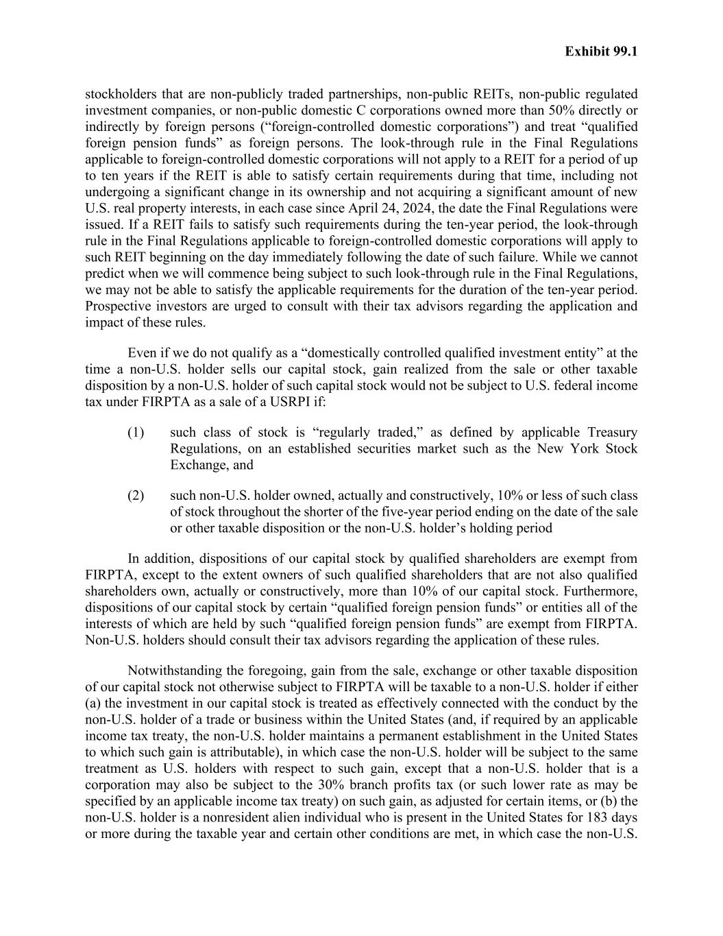 Exhibit 99.1 stockholders that are non-publicly traded partnerships, non-public REITs, non-public regulated investment companies, or non-public domestic C corporations owned more than 50% directly or indirectly by foreign persons (“foreign-controlled domestic corporations”) and treat “qualified foreign pension funds” as foreign persons. The look-through rule in the Final Regulations applicable to foreign-controlled domestic corporations will not apply to a REIT for a period of up to ten years if the REIT is able to satisfy certain requirements during that time, including not undergoing a significant change in its ownership and not acquiring a significant amount of new U.S. real property interests, in each case since April 24, 2024, the date the Final Regulations were issued. If a REIT fails to satisfy such requirements during the ten-year period, the look-through rule in the Final Regulations applicable to foreign-controlled domestic corporations will apply to such REIT beginning on the day immediately following the date of such failure. While we cannot predict when we will commence being subject to such look-through rule in the Final Regulations, we may not be able to satisfy the applicable requirements for the duration of the ten-year period. Prospective investors are urged to consult with their tax advisors regarding the application and impact of these rules. Even if we do not qualify as a “domestically controlled qualified investment entity” at the time a non-U.S. holder sells our capital stock, gain realized from the sale or other taxable disposition by a non-U.S. holder of such capital stock would not be subject to U.S. federal income tax under FIRPTA as a sale of a USRPI if: (1) such class of stock is “regularly traded,” as defined by applicable Treasury Regulations, on an established securities market such as the New York Stock Exchange, and (2) such non-U.S. holder owned, actually and constructively, 10% or less of such class of stock throughout the shorter of the five-year period ending on the date of the sale or other taxable disposition or the non-U.S. holder’s holding period In addition, dispositions of our capital stock by qualified shareholders are exempt from FIRPTA, except to the extent owners of such qualified shareholders that are not also qualified shareholders own, actually or constructively, more than 10% of our capital stock. Furthermore, dispositions of our capital stock by certain “qualified foreign pension funds” or entities all of the interests of which are held by such “qualified foreign pension funds” are exempt from FIRPTA. Non-U.S. holders should consult their tax advisors regarding the application of these rules. Notwithstanding the foregoing, gain from the sale, exchange or other taxable disposition of our capital stock not otherwise subject to FIRPTA will be taxable to a non-U.S. holder if either (a) the investment in our capital stock is treated as effectively connected with the conduct by the non-U.S. holder of a trade or business within the United States (and, if required by an applicable income tax treaty, the non-U.S. holder maintains a permanent establishment in the United States to which such gain is attributable), in which case the non-U.S. holder will be subject to the same treatment as U.S. holders with respect to such gain, except that a non-U.S. holder that is a corporation may also be subject to the 30% branch profits tax (or such lower rate as may be specified by an applicable income tax treaty) on such gain, as adjusted for certain items, or (b) the non-U.S. holder is a nonresident alien individual who is present in the United States for 183 days or more during the taxable year and certain other conditions are met, in which case the non-U.S.