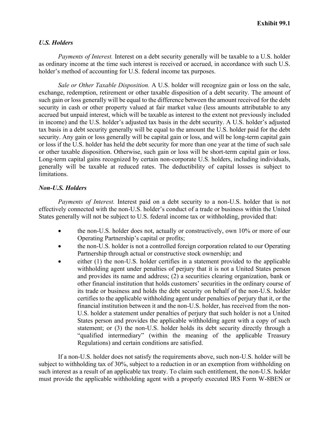 Exhibit 99.1 U.S. Holders Payments of Interest. Interest on a debt security generally will be taxable to a U.S. holder as ordinary income at the time such interest is received or accrued, in accordance with such U.S. holder’s method of accounting for U.S. federal income tax purposes. Sale or Other Taxable Disposition. A U.S. holder will recognize gain or loss on the sale, exchange, redemption, retirement or other taxable disposition of a debt security. The amount of such gain or loss generally will be equal to the difference between the amount received for the debt security in cash or other property valued at fair market value (less amounts attributable to any accrued but unpaid interest, which will be taxable as interest to the extent not previously included in income) and the U.S. holder’s adjusted tax basis in the debt security. A U.S. holder’s adjusted tax basis in a debt security generally will be equal to the amount the U.S. holder paid for the debt security. Any gain or loss generally will be capital gain or loss, and will be long-term capital gain or loss if the U.S. holder has held the debt security for more than one year at the time of such sale or other taxable disposition. Otherwise, such gain or loss will be short-term capital gain or loss. Long-term capital gains recognized by certain non-corporate U.S. holders, including individuals, generally will be taxable at reduced rates. The deductibility of capital losses is subject to limitations. Non-U.S. Holders Payments of Interest. Interest paid on a debt security to a non-U.S. holder that is not effectively connected with the non-U.S. holder’s conduct of a trade or business within the United States generally will not be subject to U.S. federal income tax or withholding, provided that: • the non-U.S. holder does not, actually or constructively, own 10% or more of our Operating Partnership’s capital or profits; • the non-U.S. holder is not a controlled foreign corporation related to our Operating Partnership through actual or constructive stock ownership; and • either (1) the non-U.S. holder certifies in a statement provided to the applicable withholding agent under penalties of perjury that it is not a United States person and provides its name and address; (2) a securities clearing organization, bank or other financial institution that holds customers’ securities in the ordinary course of its trade or business and holds the debt security on behalf of the non-U.S. holder certifies to the applicable withholding agent under penalties of perjury that it, or the financial institution between it and the non-U.S. holder, has received from the non- U.S. holder a statement under penalties of perjury that such holder is not a United States person and provides the applicable withholding agent with a copy of such statement; or (3) the non-U.S. holder holds its debt security directly through a “qualified intermediary” (within the meaning of the applicable Treasury Regulations) and certain conditions are satisfied. If a non-U.S. holder does not satisfy the requirements above, such non-U.S. holder will be subject to withholding tax of 30%, subject to a reduction in or an exemption from withholding on such interest as a result of an applicable tax treaty. To claim such entitlement, the non-U.S. holder must provide the applicable withholding agent with a properly executed IRS Form W-8BEN or