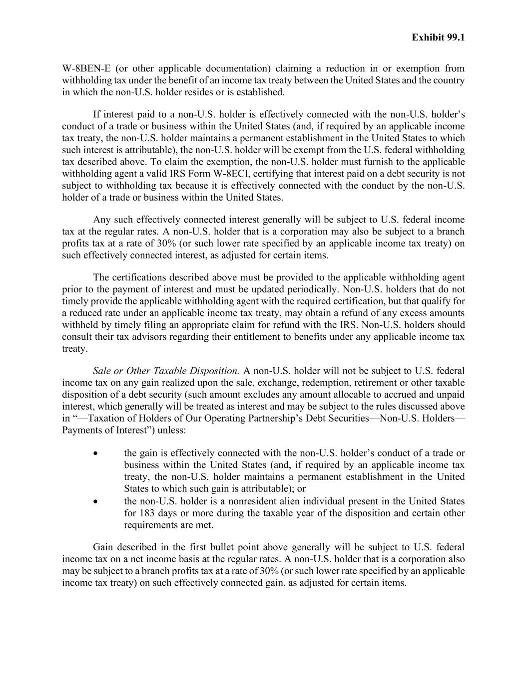 Exhibit 99.1 W-8BEN-E (or other applicable documentation) claiming a reduction in or exemption from withholding tax under the benefit of an income tax treaty between the United States and the country in which the non-U.S. holder resides or is established. If interest paid to a non-U.S. holder is effectively connected with the non-U.S. holder’s conduct of a trade or business within the United States (and, if required by an applicable income tax treaty, the non-U.S. holder maintains a permanent establishment in the United States to which such interest is attributable), the non-U.S. holder will be exempt from the U.S. federal withholding tax described above. To claim the exemption, the non-U.S. holder must furnish to the applicable withholding agent a valid IRS Form W-8ECI, certifying that interest paid on a debt security is not subject to withholding tax because it is effectively connected with the conduct by the non-U.S. holder of a trade or business within the United States. Any such effectively connected interest generally will be subject to U.S. federal income tax at the regular rates. A non-U.S. holder that is a corporation may also be subject to a branch profits tax at a rate of 30% (or such lower rate specified by an applicable income tax treaty) on such effectively connected interest, as adjusted for certain items. The certifications described above must be provided to the applicable withholding agent prior to the payment of interest and must be updated periodically. Non-U.S. holders that do not timely provide the applicable withholding agent with the required certification, but that qualify for a reduced rate under an applicable income tax treaty, may obtain a refund of any excess amounts withheld by timely filing an appropriate claim for refund with the IRS. Non-U.S. holders should consult their tax advisors regarding their entitlement to benefits under any applicable income tax treaty. Sale or Other Taxable Disposition. A non-U.S. holder will not be subject to U.S. federal income tax on any gain realized upon the sale, exchange, redemption, retirement or other taxable disposition of a debt security (such amount excludes any amount allocable to accrued and unpaid interest, which generally will be treated as interest and may be subject to the rules discussed above in “—Taxation of Holders of Our Operating Partnership’s Debt Securities—Non-U.S. Holders— Payments of Interest”) unless: • the gain is effectively connected with the non-U.S. holder’s conduct of a trade or business within the United States (and, if required by an applicable income tax treaty, the non-U.S. holder maintains a permanent establishment in the United States to which such gain is attributable); or • the non-U.S. holder is a nonresident alien individual present in the United States for 183 days or more during the taxable year of the disposition and certain other requirements are met. Gain described in the first bullet point above generally will be subject to U.S. federal income tax on a net income basis at the regular rates. A non-U.S. holder that is a corporation also may be subject to a branch profits tax at a rate of 30% (or such lower rate specified by an applicable income tax treaty) on such effectively connected gain, as adjusted for certain items.