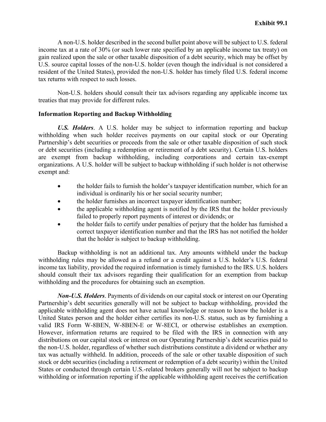 Exhibit 99.1 A non-U.S. holder described in the second bullet point above will be subject to U.S. federal income tax at a rate of 30% (or such lower rate specified by an applicable income tax treaty) on gain realized upon the sale or other taxable disposition of a debt security, which may be offset by U.S. source capital losses of the non-U.S. holder (even though the individual is not considered a resident of the United States), provided the non-U.S. holder has timely filed U.S. federal income tax returns with respect to such losses. Non-U.S. holders should consult their tax advisors regarding any applicable income tax treaties that may provide for different rules. Information Reporting and Backup Withholding U.S. Holders. A U.S. holder may be subject to information reporting and backup withholding when such holder receives payments on our capital stock or our Operating Partnership’s debt securities or proceeds from the sale or other taxable disposition of such stock or debt securities (including a redemption or retirement of a debt security). Certain U.S. holders are exempt from backup withholding, including corporations and certain tax-exempt organizations. A U.S. holder will be subject to backup withholding if such holder is not otherwise exempt and: • the holder fails to furnish the holder’s taxpayer identification number, which for an individual is ordinarily his or her social security number; • the holder furnishes an incorrect taxpayer identification number; • the applicable withholding agent is notified by the IRS that the holder previously failed to properly report payments of interest or dividends; or • the holder fails to certify under penalties of perjury that the holder has furnished a correct taxpayer identification number and that the IRS has not notified the holder that the holder is subject to backup withholding. Backup withholding is not an additional tax. Any amounts withheld under the backup withholding rules may be allowed as a refund or a credit against a U.S. holder’s U.S. federal income tax liability, provided the required information is timely furnished to the IRS. U.S. holders should consult their tax advisors regarding their qualification for an exemption from backup withholding and the procedures for obtaining such an exemption. Non-U.S. Holders. Payments of dividends on our capital stock or interest on our Operating Partnership’s debt securities generally will not be subject to backup withholding, provided the applicable withholding agent does not have actual knowledge or reason to know the holder is a United States person and the holder either certifies its non-U.S. status, such as by furnishing a valid IRS Form W-8BEN, W-8BEN-E or W-8ECI, or otherwise establishes an exemption. However, information returns are required to be filed with the IRS in connection with any distributions on our capital stock or interest on our Operating Partnership’s debt securities paid to the non-U.S. holder, regardless of whether such distributions constitute a dividend or whether any tax was actually withheld. In addition, proceeds of the sale or other taxable disposition of such stock or debt securities (including a retirement or redemption of a debt security) within the United States or conducted through certain U.S.-related brokers generally will not be subject to backup withholding or information reporting if the applicable withholding agent receives the certification