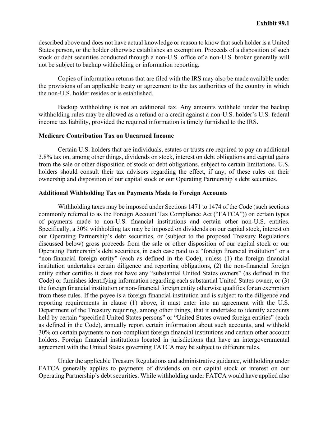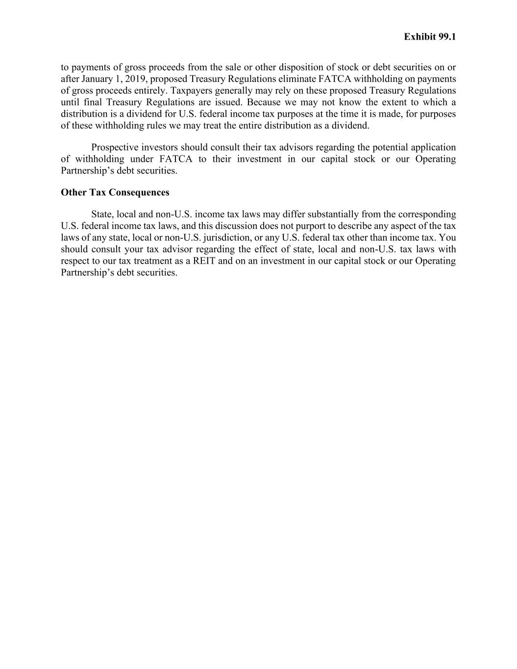 Exhibit 99.1 to payments of gross proceeds from the sale or other disposition of stock or debt securities on or after January 1, 2019, proposed Treasury Regulations eliminate FATCA withholding on payments of gross proceeds entirely. Taxpayers generally may rely on these proposed Treasury Regulations until final Treasury Regulations are issued. Because we may not know the extent to which a distribution is a dividend for U.S. federal income tax purposes at the time it is made, for purposes of these withholding rules we may treat the entire distribution as a dividend. Prospective investors should consult their tax advisors regarding the potential application of withholding under FATCA to their investment in our capital stock or our Operating Partnership’s debt securities. Other Tax Consequences State, local and non-U.S. income tax laws may differ substantially from the corresponding U.S. federal income tax laws, and this discussion does not purport to describe any aspect of the tax laws of any state, local or non-U.S. jurisdiction, or any U.S. federal tax other than income tax. You should consult your tax advisor regarding the effect of state, local and non-U.S. tax laws with respect to our tax treatment as a REIT and on an investment in our capital stock or our Operating Partnership’s debt securities.